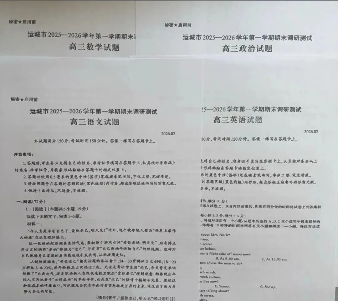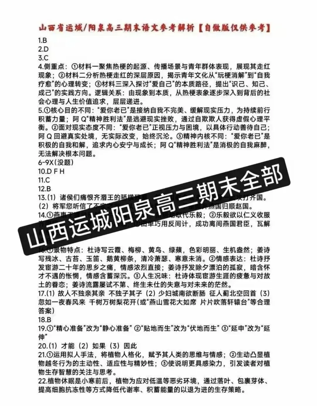 全科发送!【山西思而行联考】阳泉/大同/运城市2025-2026学年第一学期高三期末调研测试全科答案及试题