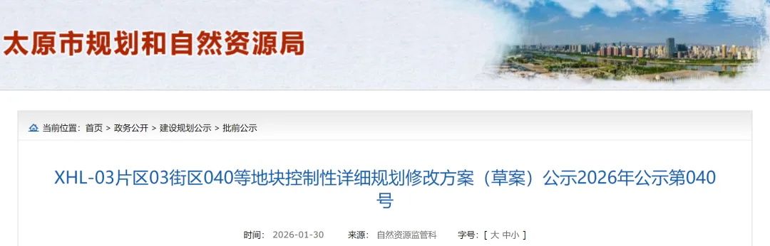 1月30日,太原市规划和自然资源局发布了XHL-03片区03街区040等地块控制性详细规划修改方案(草案)公示2026年公示第040号。