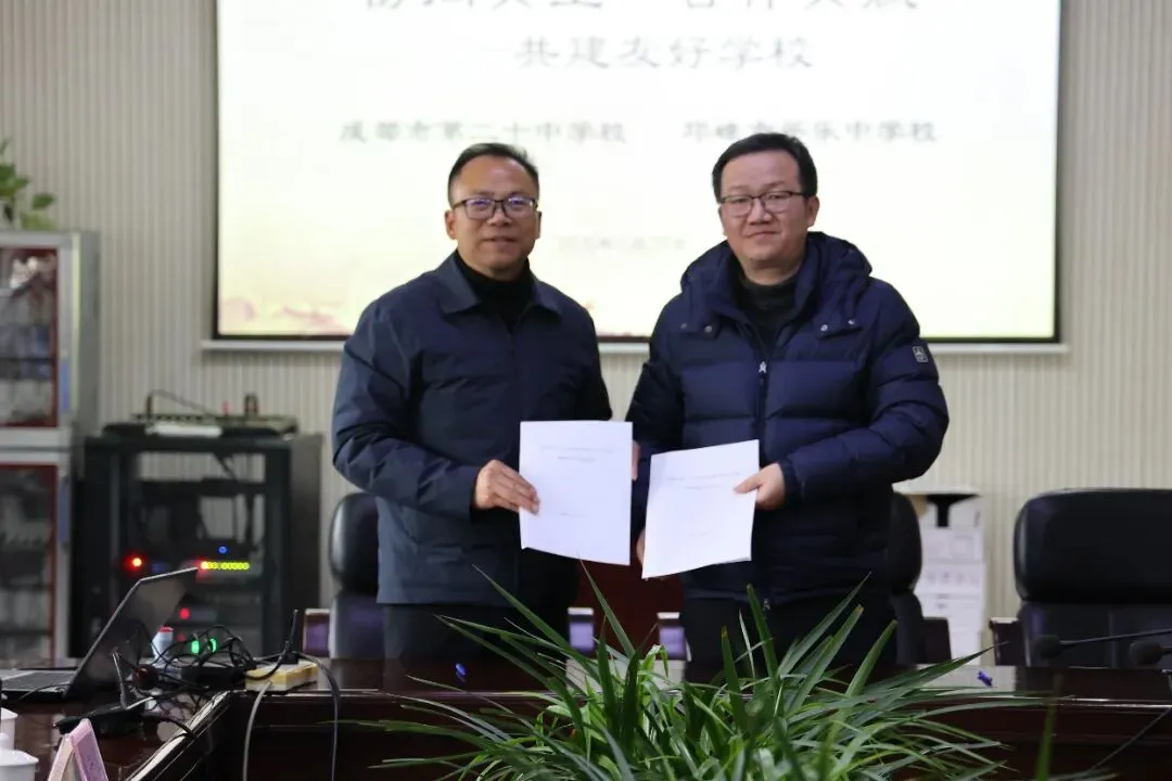 1月29日,邛崃市平乐中学校党总支书记李裕明、副校长李黎明、办公室主任贺云华一行莅临我校交流访问,双方就教育教学经验共享、师资队伍共建、学生发展共育等方面展开深入探讨,并正式签约共建友好学校。