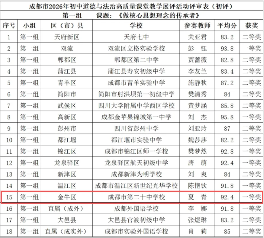 近日,在成都市2026年初中道德与法治高质量课堂教学展评活动中,我校青年教师夏青的课例《做核心思想理念的传承者》在初评(说课)阶段荣获一等奖。