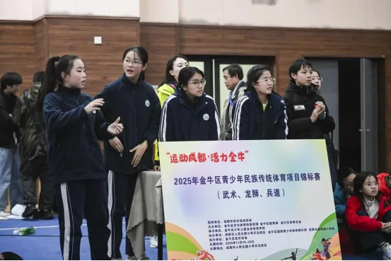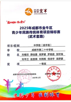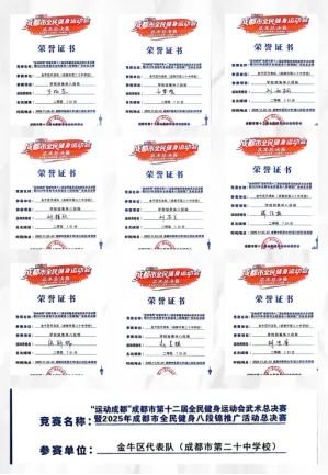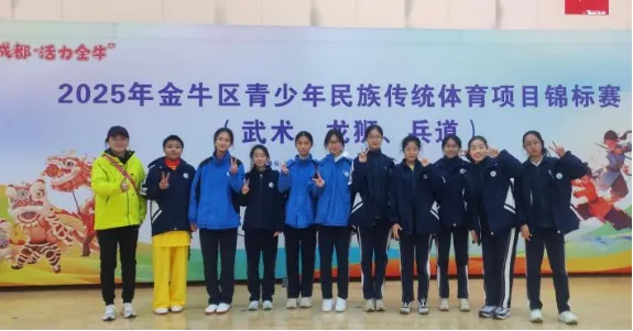 区级赛事中,2025年11月金牛区青少年民族传统体育项目锦标赛上,我校武术队全面发力、多点突破:集体项目中,中学组徒手组获一等奖,集体短兵获二等奖;短兵单项中,肖翰文获男子一等奖,胡恩睿获男子三等奖,张轩瑞、高梦媛获女子一等奖;拳术项目中,薛佳露获女子初中组一等奖,张轩瑞等9名同学获女子初中组二等奖;传统短器械项目中,张轩瑞等4人获中学女子组一等奖。