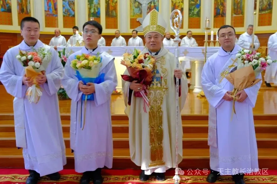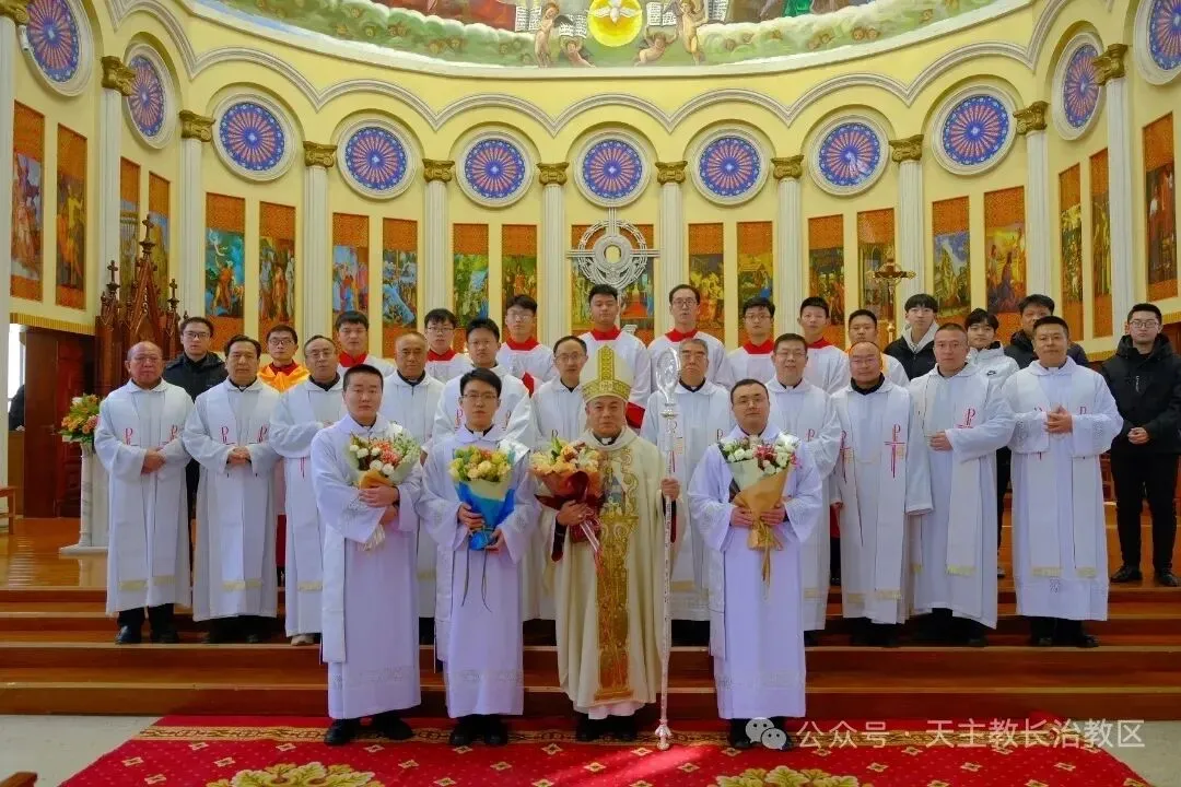2026年2月1日上午九点,天主教长治教区主教座堂内圣乐悠扬、福盈满堂,教区为张浩然·伯多禄、王晋·若望、刘晓恒·伯多禄三位修士授予执事职典礼在此隆重举行,由长治教区丁令斌主教主礼,教区11位神父、部分修士修女、新执事的亲友及教友五百余人,共同见证了这一神圣时刻。