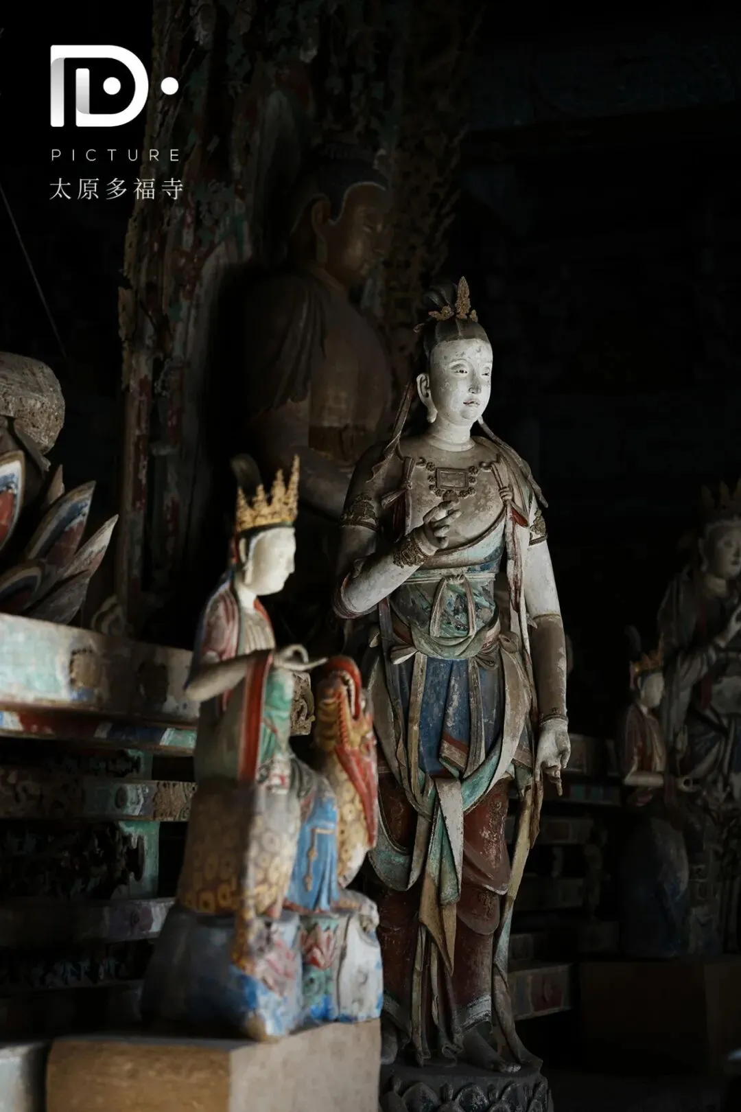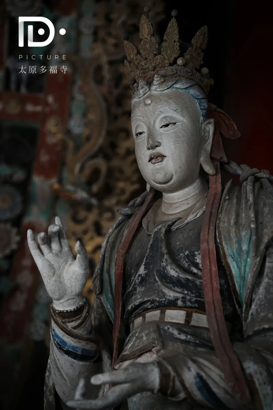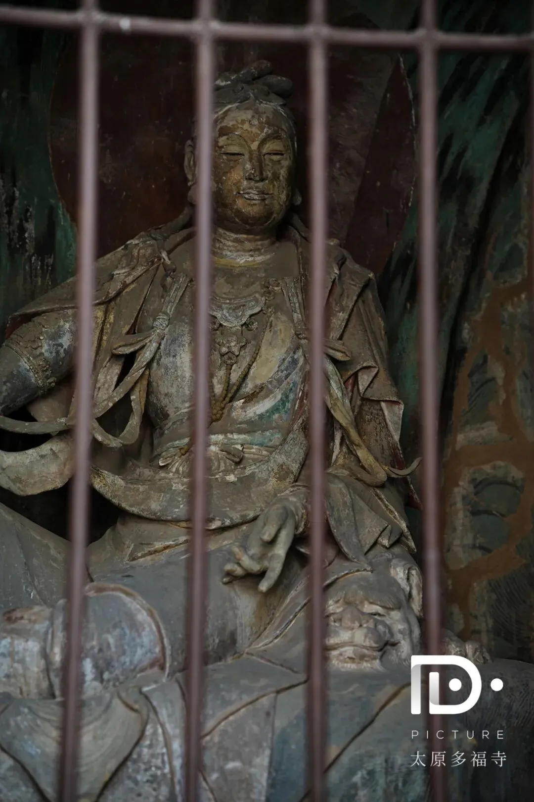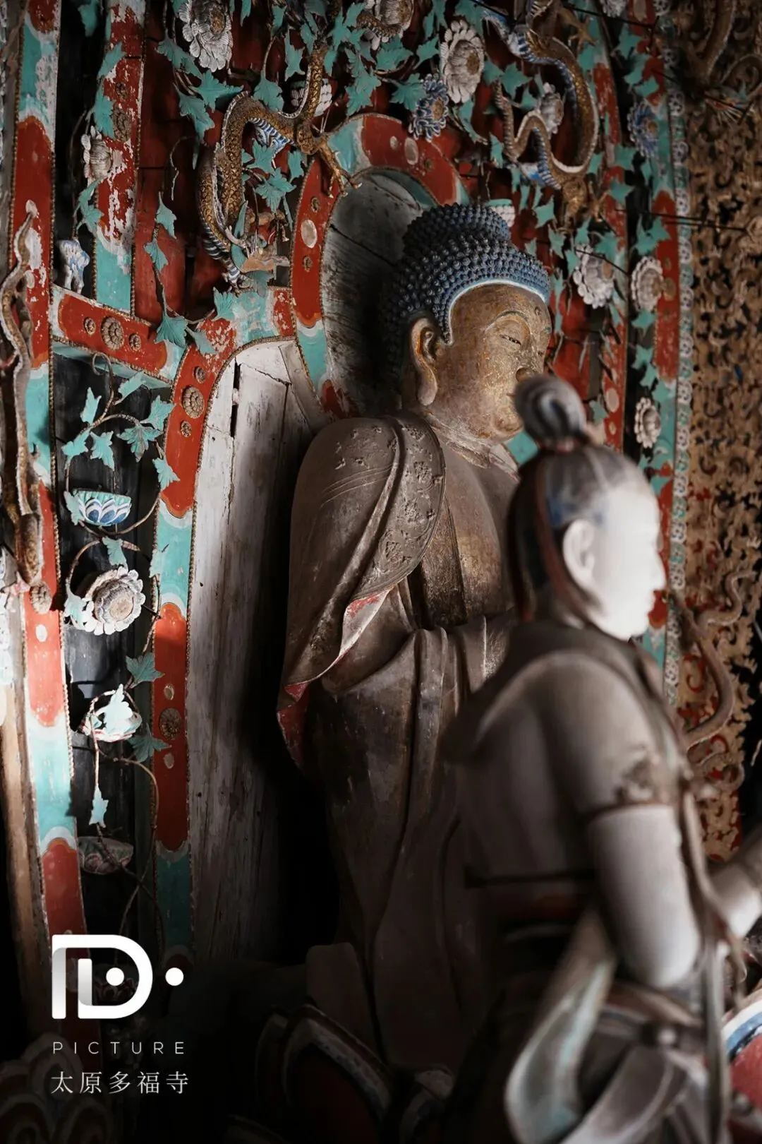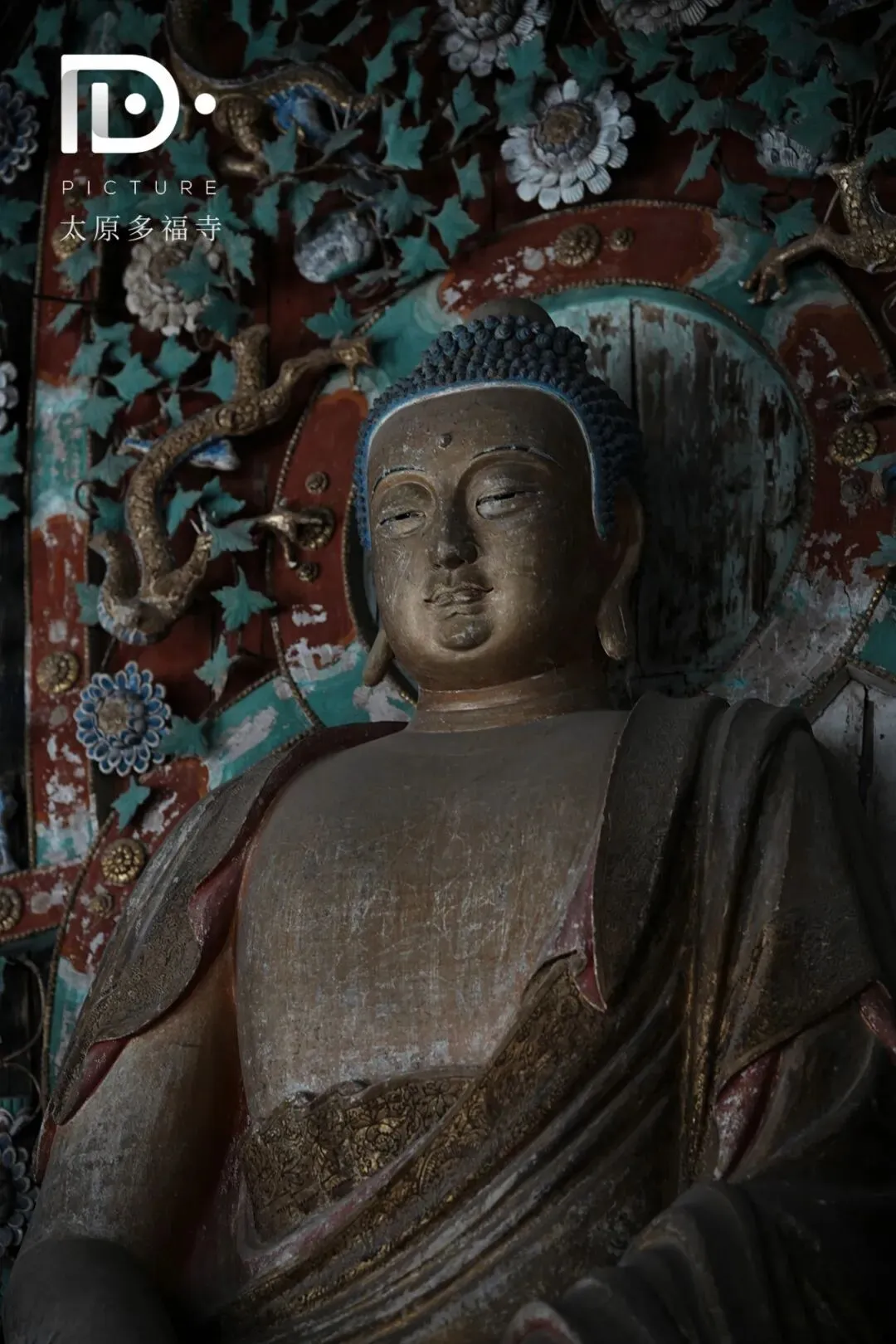 多福寺建于唐代贞元二年(786年),原名崛围教寺,宋末毁于战火,后又多次重修。多福寺坐北朝南,三进院落,主要建筑有天王殿、大雄宝殿、藏经阁、千佛殿、黑龙殿、文殊阁等,其中大雄宝殿内有彩塑14尊,两山及后墙满绘佛教故事壁画,与建筑同期,为明代壁画。寺前山巅砖塔,仍是宋代原构。寺内有霜红龛,为明末清初太原著名学者傅山隐居处。