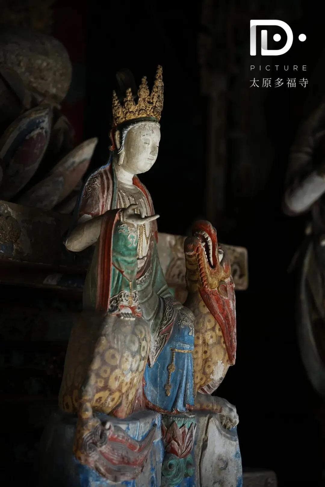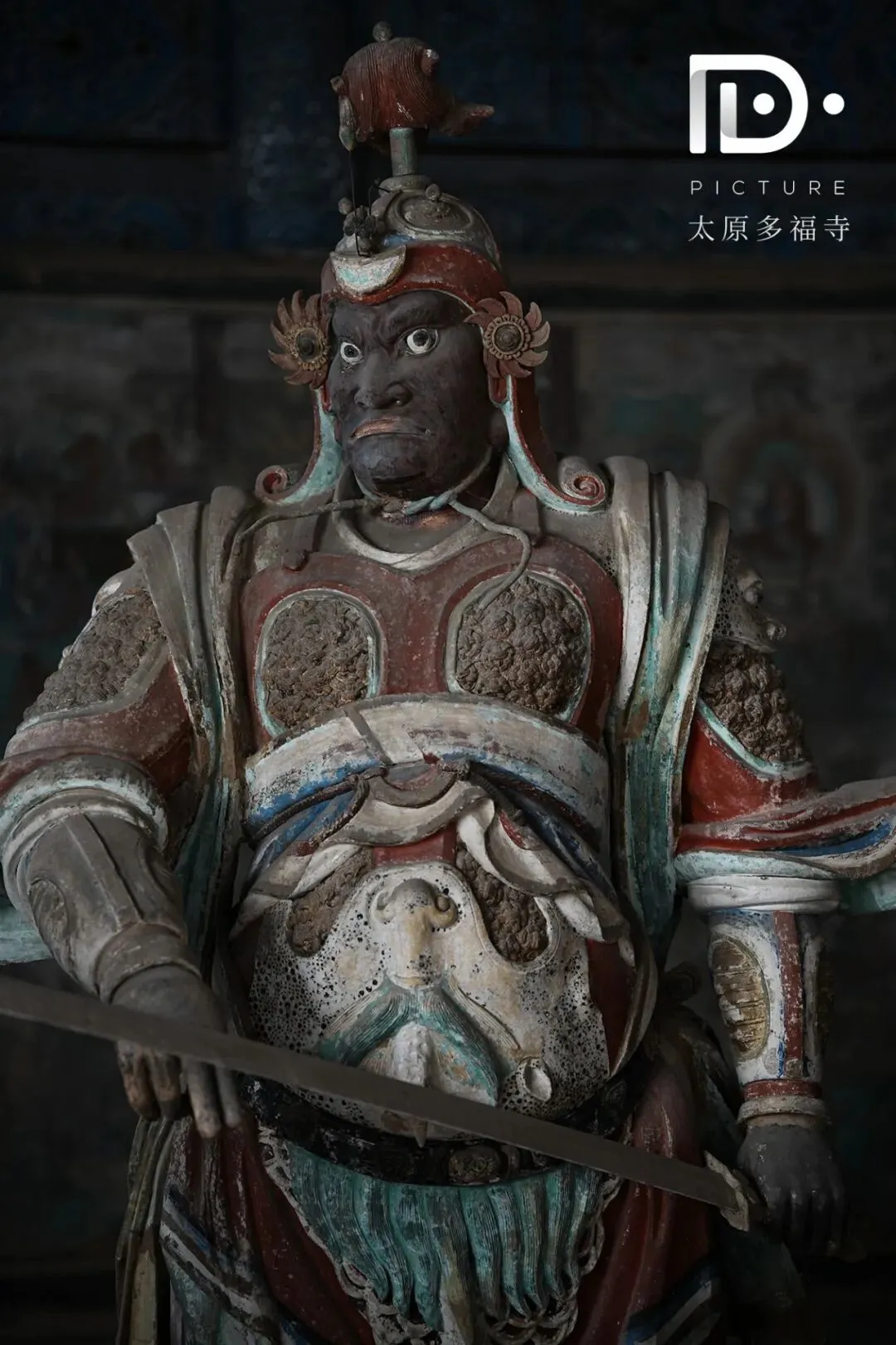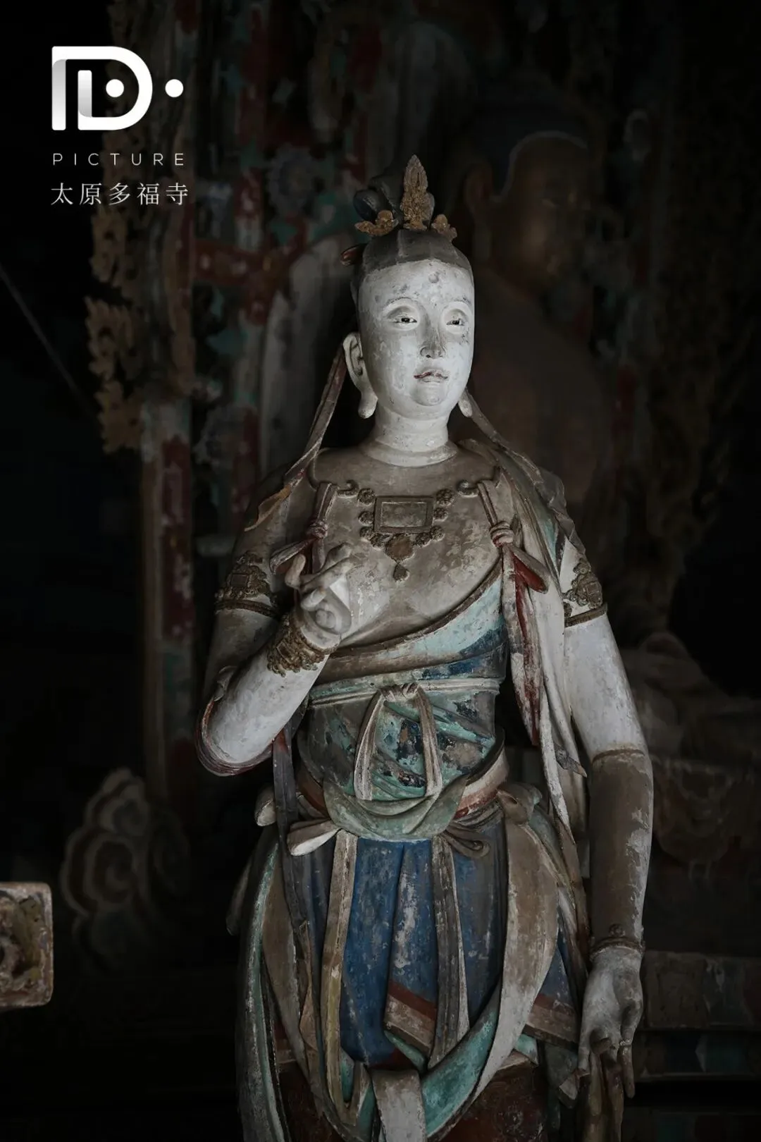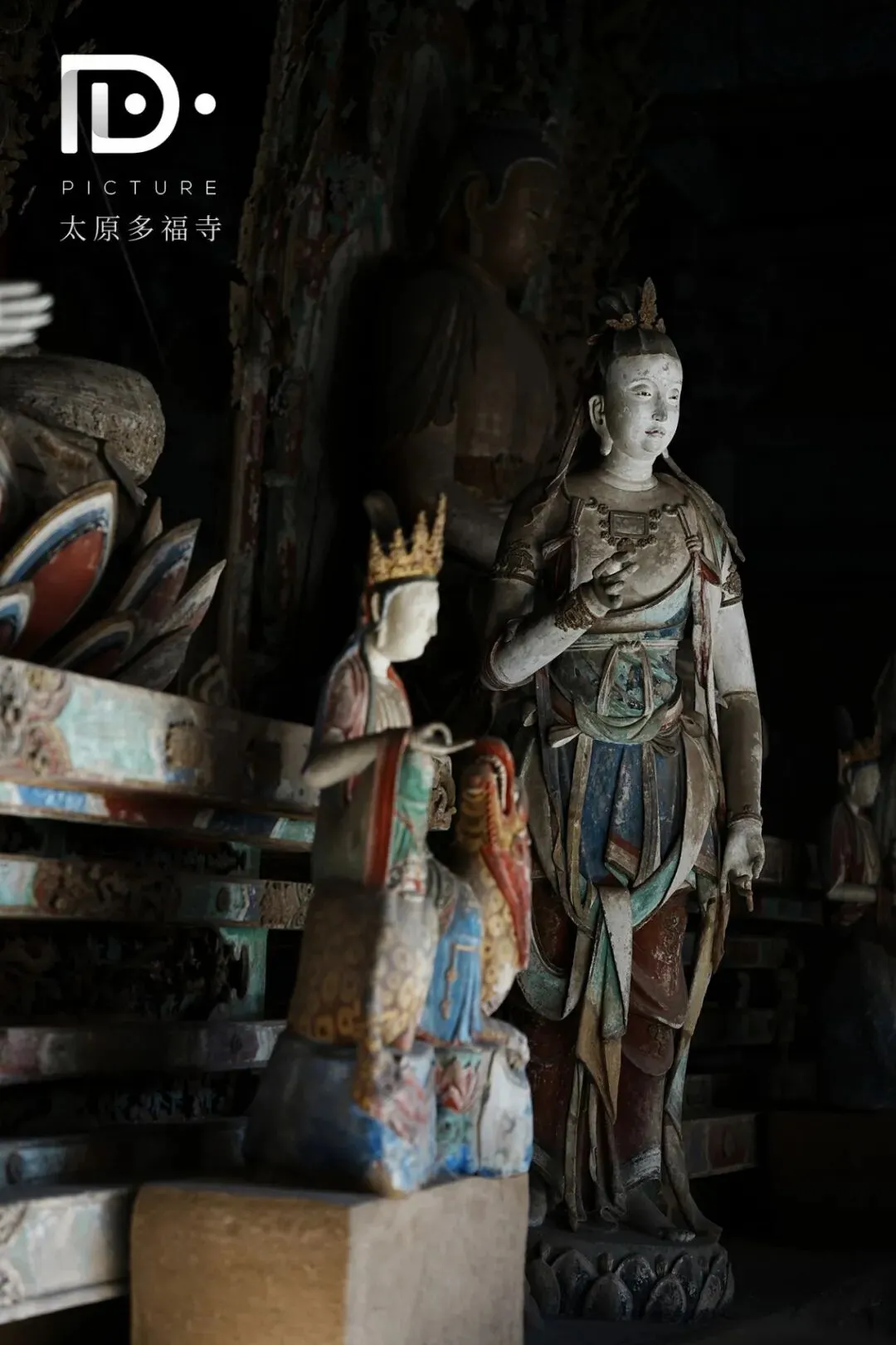 多福寺建于唐代贞元二年(786年),原名崛围教寺,宋末毁于战火,后又多次重修。多福寺坐北朝南,三进院落,主要建筑有天王殿、大雄宝殿、藏经阁、千佛殿、黑龙殿、文殊阁等,其中大雄宝殿内有彩塑14尊,两山及后墙满绘佛教故事壁画,与建筑同期,为明代壁画。寺前山巅砖塔,仍是宋代原构。寺内有霜红龛,为明末清初太原著名学者傅山隐居处。