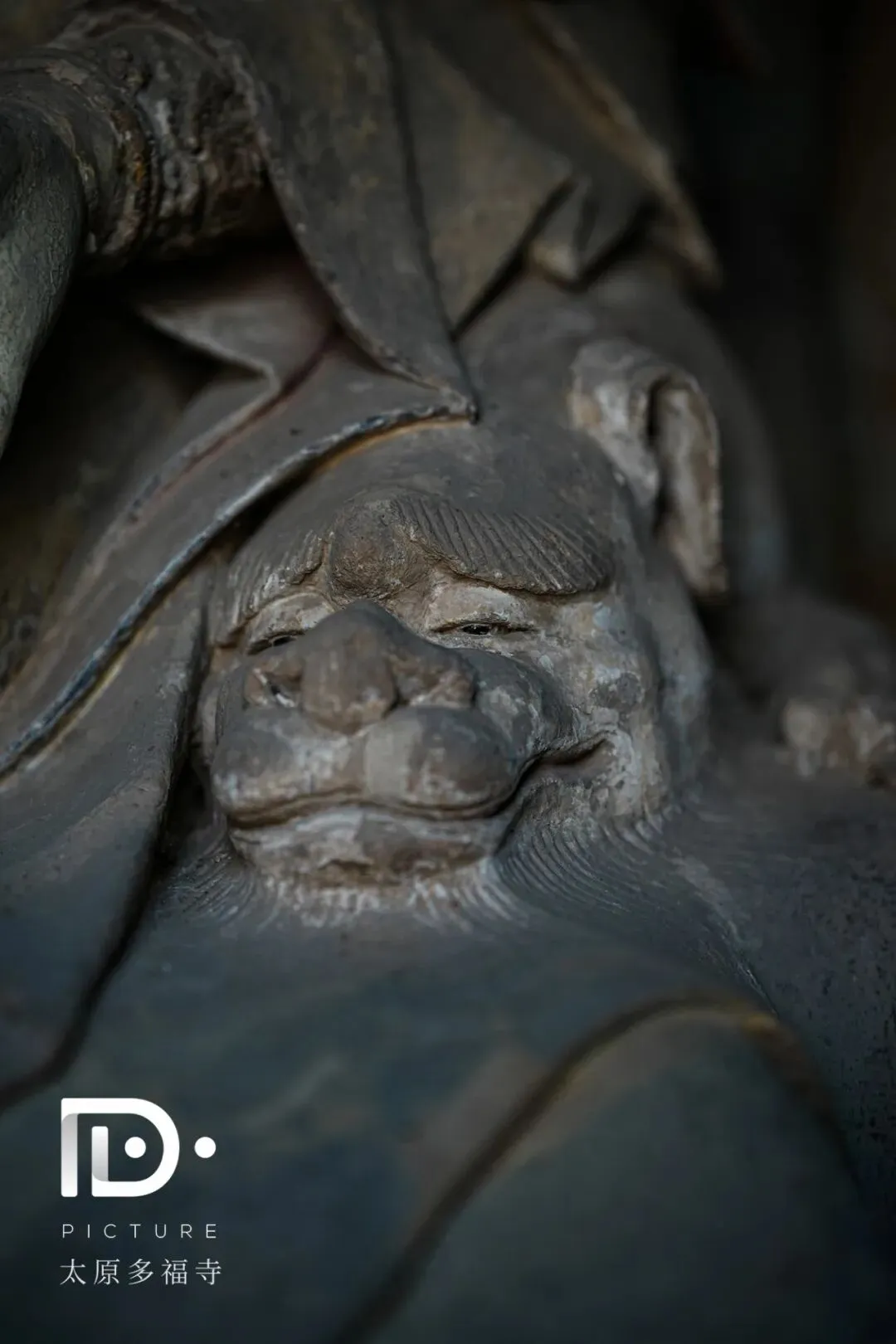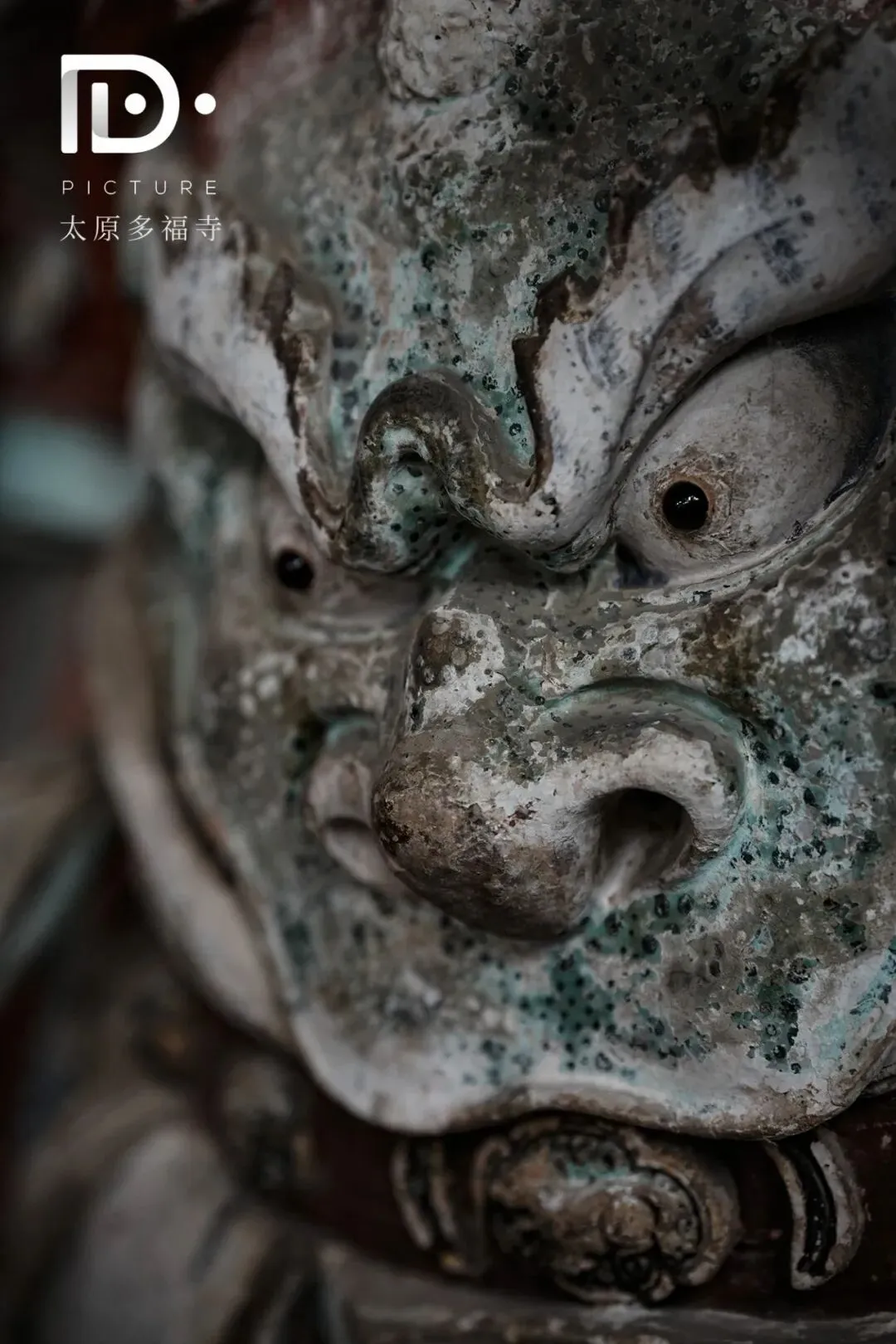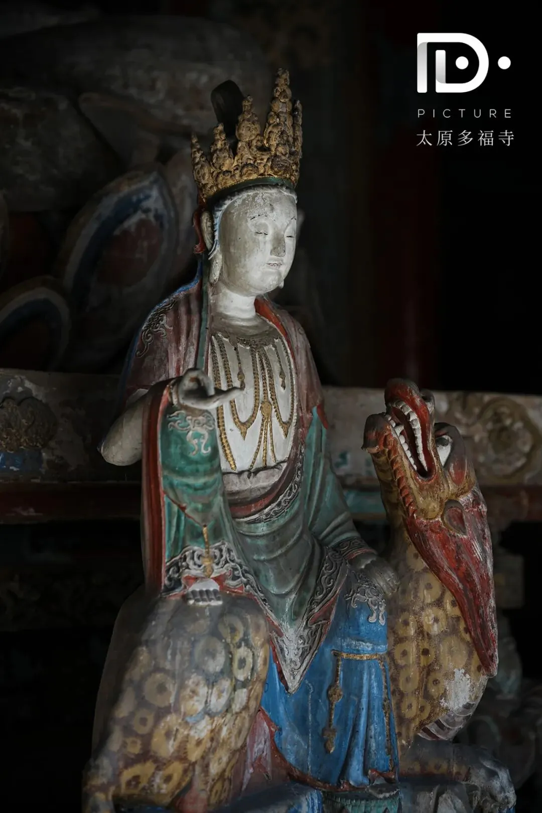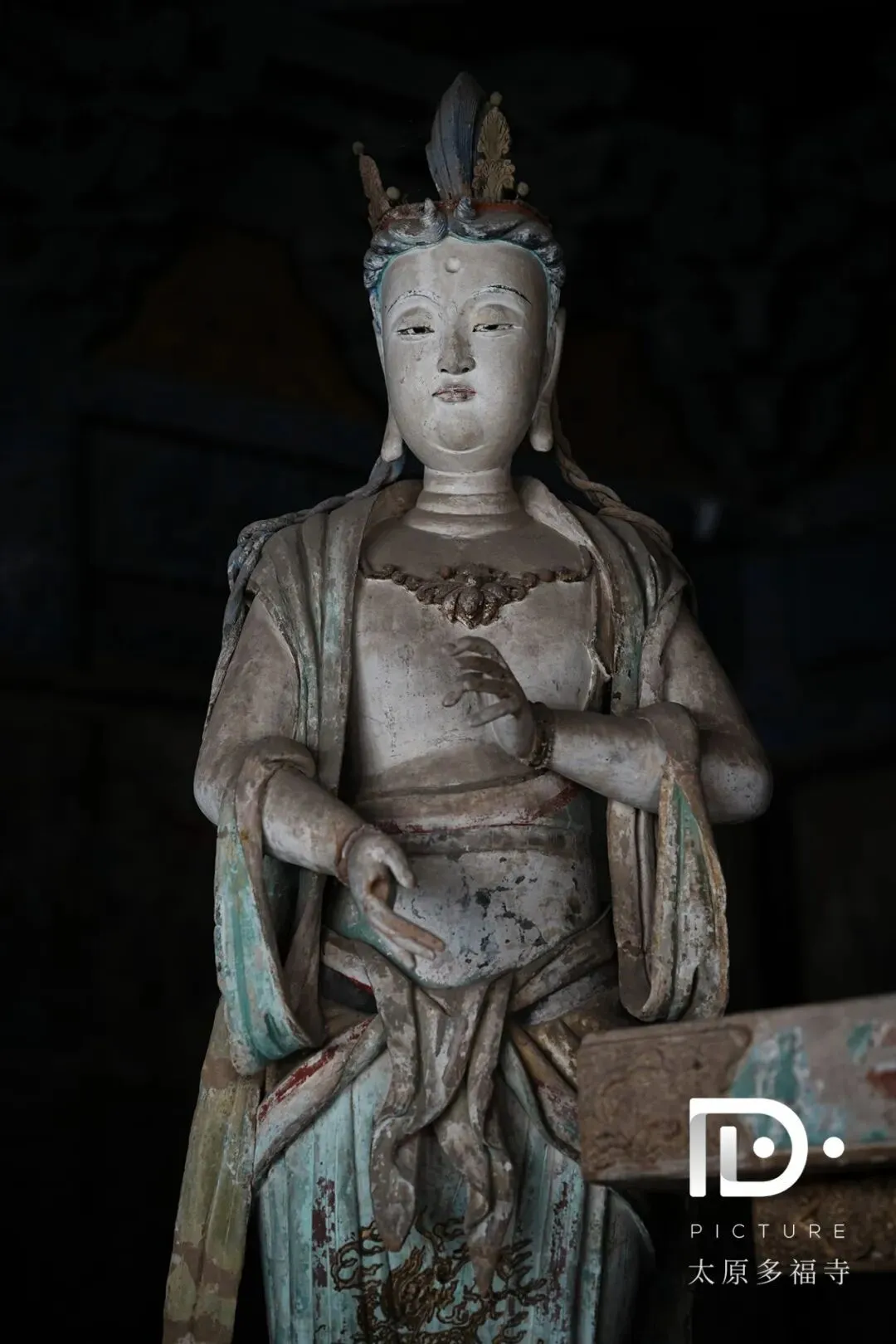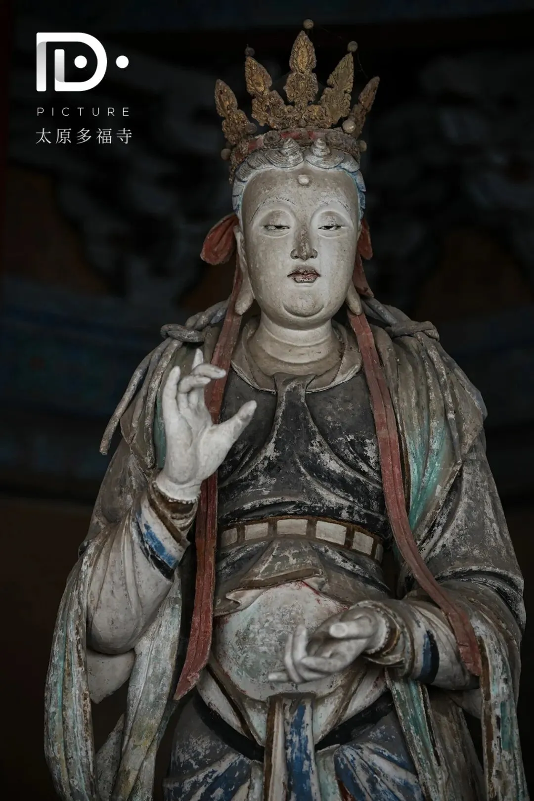 多福寺建于唐代贞元二年(786年),原名崛围教寺,宋末毁于战火,后又多次重修。多福寺坐北朝南,三进院落,主要建筑有天王殿、大雄宝殿、藏经阁、千佛殿、黑龙殿、文殊阁等,其中大雄宝殿内有彩塑14尊,两山及后墙满绘佛教故事壁画,与建筑同期,为明代壁画。寺前山巅砖塔,仍是宋代原构。寺内有霜红龛,为明末清初太原著名学者傅山隐居处。