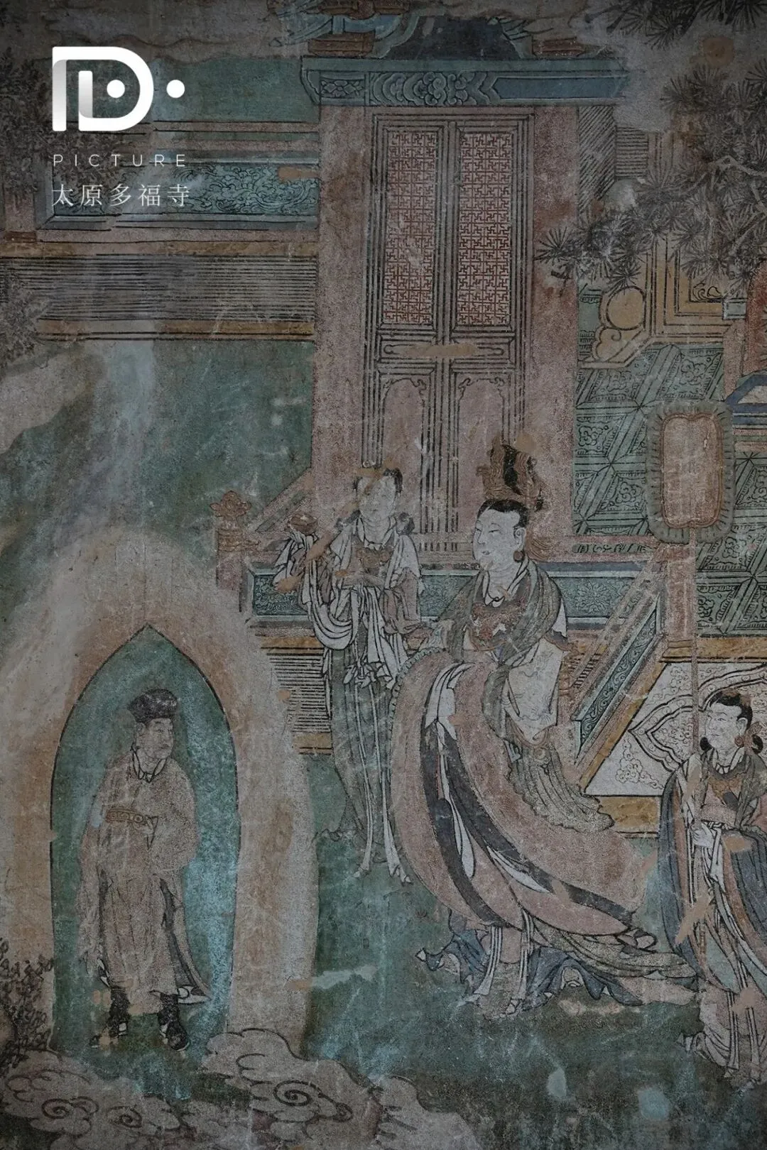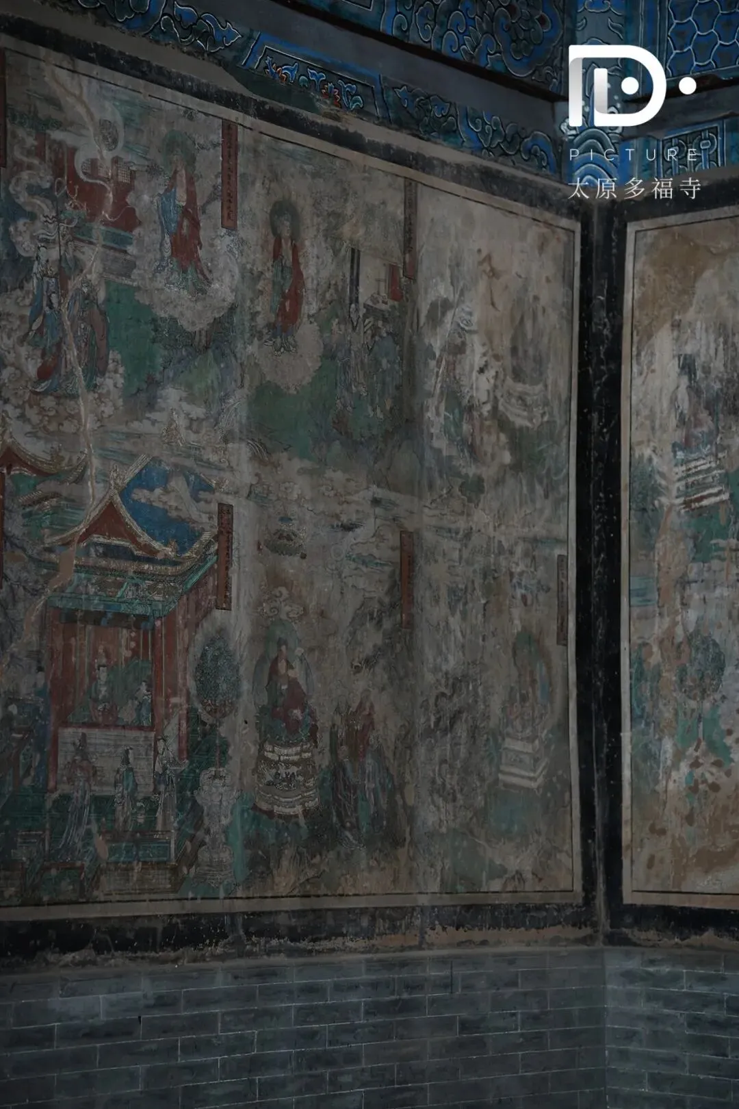 太原多福寺的明代佛传故事壁画是其最珍贵的艺术瑰宝,集中保存在大雄宝殿内。绘制于明代(具体为明景泰七年,公元1456年)。虽然部分可能经过清代局部补绘,但整体保留了鲜明的明代风格和原始的粉本(画稿)。