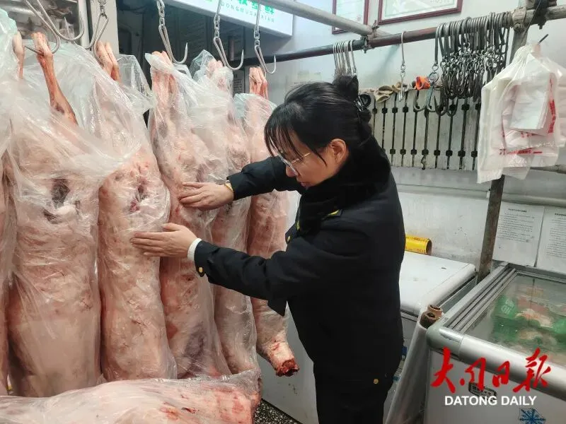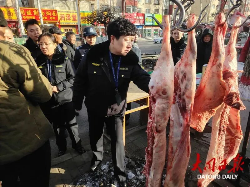1月29日,云冈区食药安办组织区市场监督管理局、区公安局、区农业农村局、区城市管理局执法人员开展节前突击检查,严查私屠滥宰,确保肉制品来源可溯,守护春节期间餐桌肉食安全。