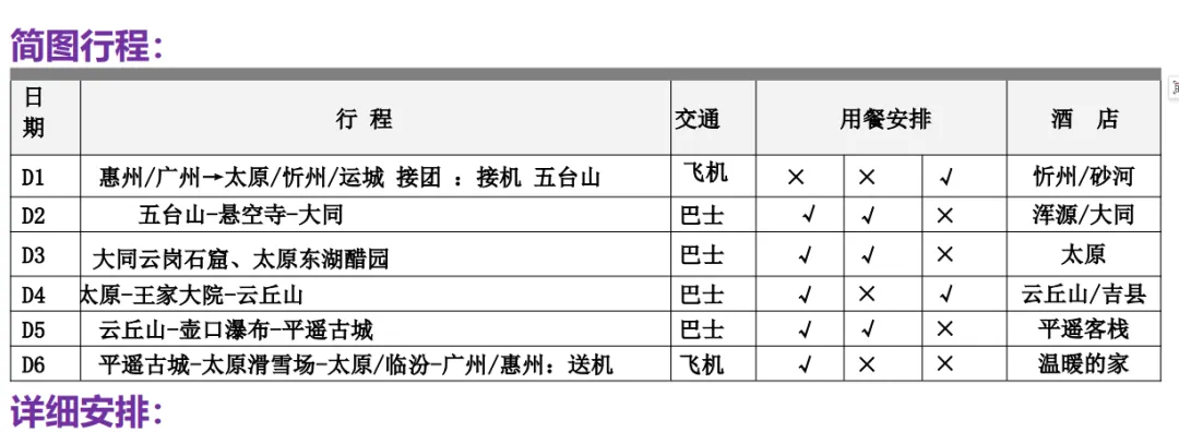 | 1. 【交通】:含惠州到机场的接送车,含到太原往返机票。往返机票为团队票,往返不可以改签,不 可退票,请客人注意;团队机票一经开出,不得更签,不得签转,不得退票。2. 【住宿】:全程携程四钻+1 晚平遥客栈+升级 1 晚五钻国际品牌酒店. 【单房差】不提供自然单间 三 人间或加床、如产生单房差请客人自补;3.【用餐】:含 5 早 6 正。餐标 50 元/人/正(早餐酒店含,自愿放弃费用不退,正餐十人一桌、八菜一 汤、主食足量、不含酒水。人数增减时,菜量酌情增减,但维持餐标不变)若出团人数不足 8 人,则当 地正餐客人自理,按以上餐标当地退回餐费。4.【门票】:含行程中部分景点首道大门票。行程中门票价格为综合包价产品,若持长者证、学生证、军官证 等有效证件享受门票优惠的,旅行社则按照采购优惠价在团费中退减相应门票差价,最终解释权归属我社。注:旅游项 目费用如遇到国家政策性调价,将收取差价。成人补门票 500 元,备注:2025 年 7 月 16 日起,五台山最新门票规定,需持国内身份证才能享受门票优惠政策;如持港 澳台回乡证、护照等其他证件,统一按照成人票购票(门票 135 元),无长者小童优惠门票政策5.【导游】:当地优秀中文导游服务;(备注:如人数不足 8 人不安排导游,安排司机兼向导) 6.【儿童】:(2 周岁以上 12 周岁以下)小童费用含往返机票、车位、餐费。全程不含门票、不占床位。7.【其他】:旅游意外险,旅游意外保险最高赔额 30 万元/人;8.【购物】: 纯玩无购物(景中店、景区商店、特产超市不算购物店,游客自愿参观)行程中部分景点、演出场所及用餐地点存在商品销售行为,如游客自行购买,费用自理,且不视为旅行社安排购物行 为。请索要正规发票保证您的合法权益。 |