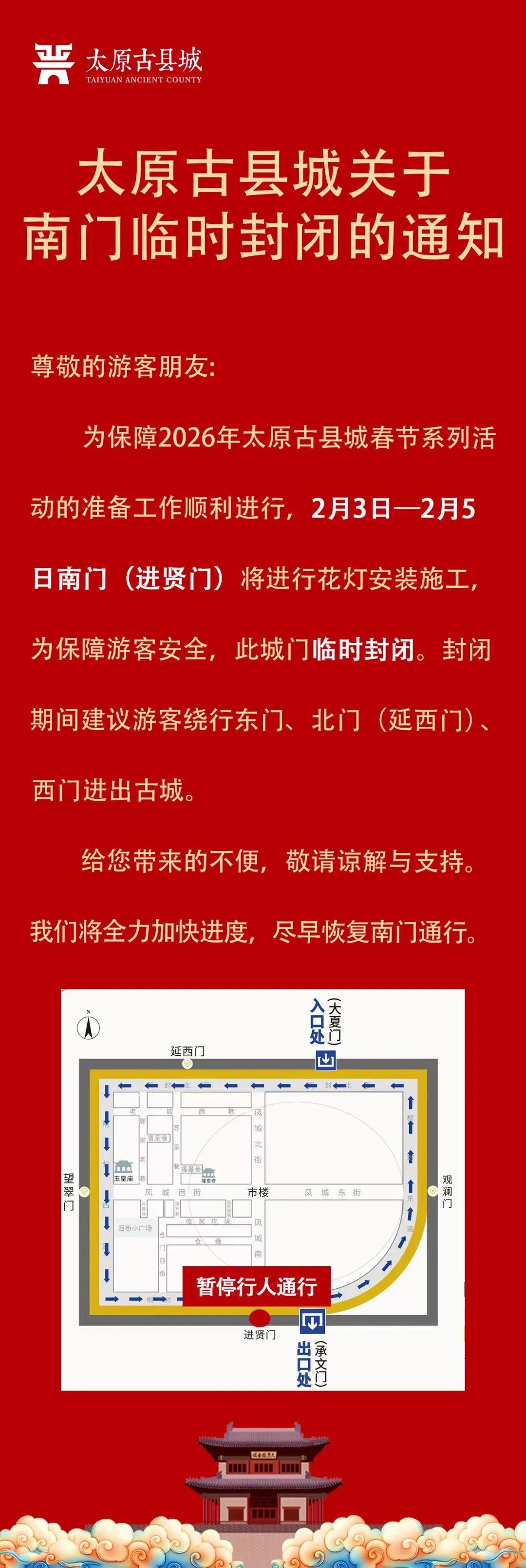 太原古县城关于南门临时封闭的通知