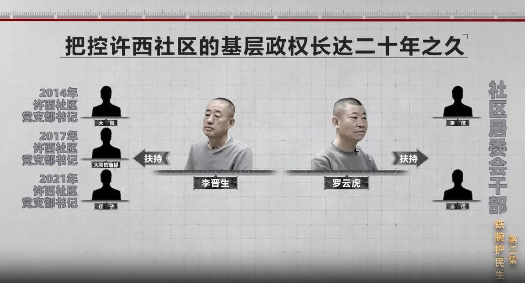 于是,李晋生利用自己的影响力先后扶持其大哥、大哥的连襟、侄子三人接连担任社区党支部书记,而罗云虎则扶持其亲信、远侄担任社区居委会干部,就这样,李罗团伙把控许西社区的基层政权长达二十年之久。