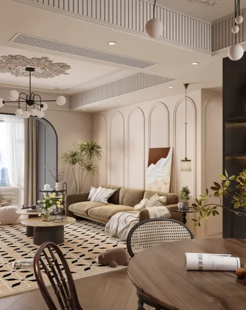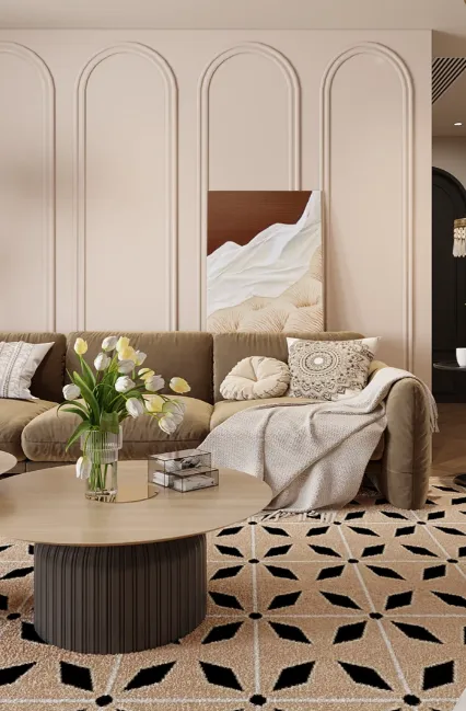 底色优先选用低饱和度中性色,适配太原大户型的开阔空间,同时为后续软装搭配预留空间。墙面、地面可选用奶白色、米杏色、浅灰色、雾霾蓝等,这些色彩自带温润感,能弱化大户型的空旷,营造慵懒惬意的氛围;顶面可保留白色,搭配简约石膏线,提升空间层次感,避免深色顶面带来的压抑感,凸显法式复古的通透感。