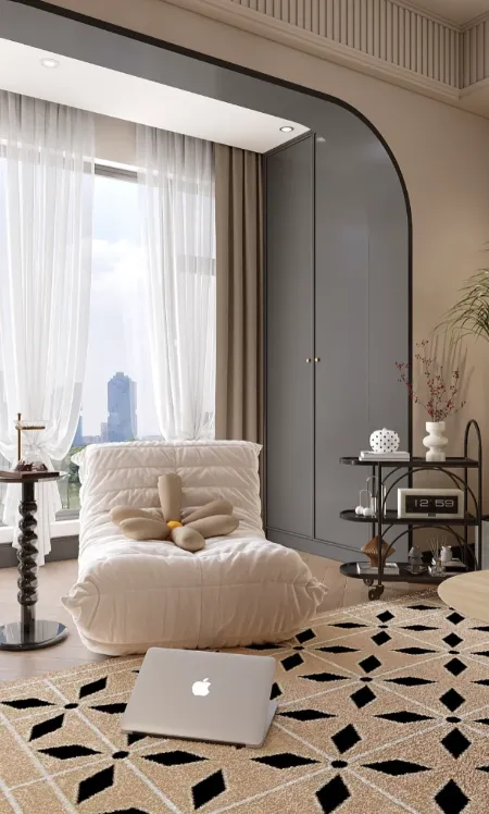 家具选择侧重“圆润线条+复古造型”,贴合慵懒感。沙发优先选大尺寸、圆润弧度的款式,面料选绒面或棉麻混纺,搭配柔软靠枕,既能满足多人休憩,又能营造慵懒惬意的氛围;餐桌可选用实木材质,搭配复古雕花底座或圆形桌面,搭配6-8把复古餐椅,兼顾实用性与仪式感,适配太原家庭聚餐需求;柜体可选用嵌入式设计,减少空间占用,柜门搭配复古造型拉手,或做无拉手设计,搭配局部雕花,凸显法式复古的精致,同时避免杂乱。