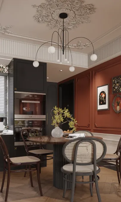 局部亮色点缀需克制,精准拿捏贵气感。可通过软装、装饰画等局部融入焦糖色、酒红色、墨绿色等复古色系,比如一款焦糖色丝绒单人椅、一幅墨绿色暗纹挂画、一组酒红色复古餐具,既能丰富空间层次,又能凸显法式复古的贵气,避免大面积亮色堆砌导致的杂乱;金属色作为辅助色,不可或缺,铜色、金色的灯具、拉手、摆件,能提升空间精致度,自带贵气感,同时避免过度闪耀,贴合慵懒低调的调性。