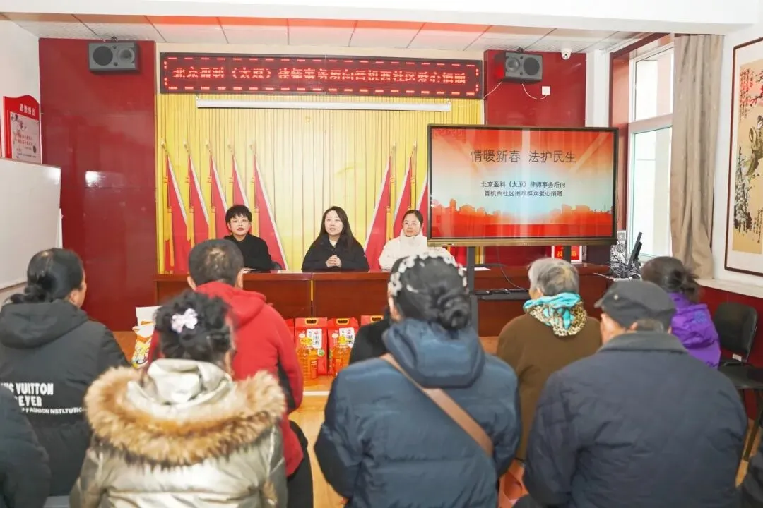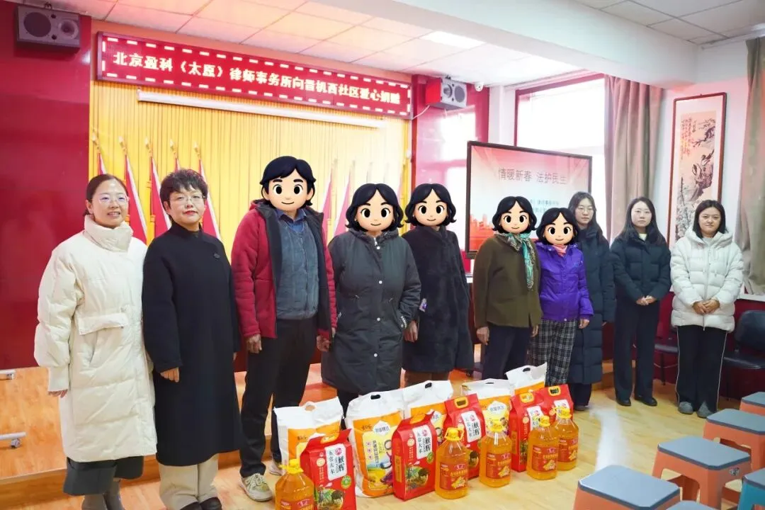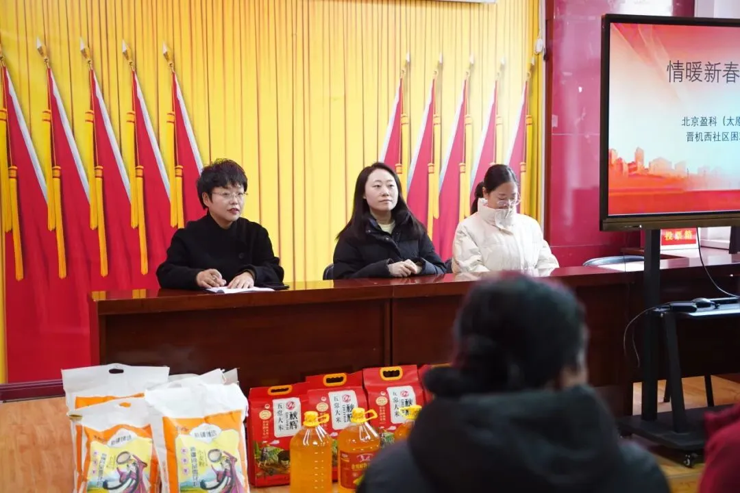 2026年1月29日,盈科太原党总支宣传委员、公益中心副主任侯柯楠律师和盈科太原公益中心秘书长秦莉芸律师带队,走进太原市万柏林区万柏林街道晋机西社区居民委员会,开展新春慰问活动,为社区困难群众送去米面油等春节物资。