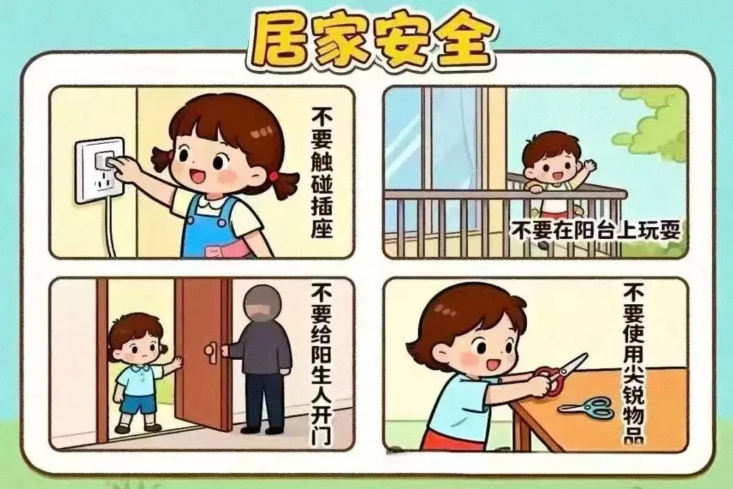 不让孩子独自一人在家,以防发生意外事故。燃气阀门要及时关闭,严防中毒。不玩插座和开关,以防触电。不攀爬阳台,门窗以及其它高处,防止跌落。叮嘱幼儿不给陌生人开门,做好安全教育工作。