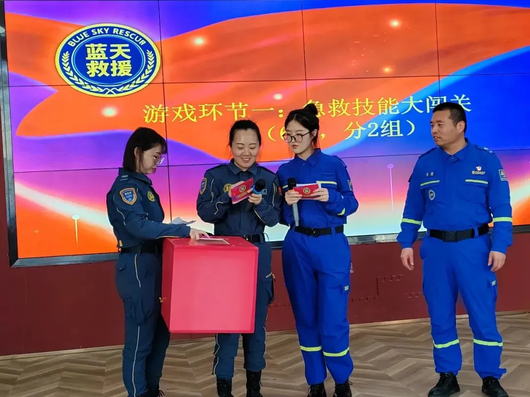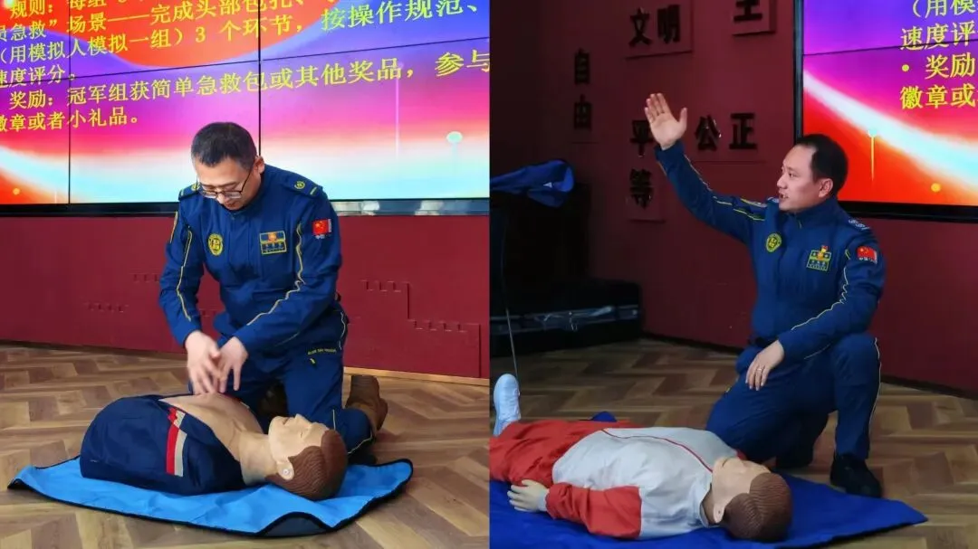 在“游戏”环节,主持人团队手持红色抽号箱登台,以抽号方式随机邀请队员上台竞技。在“急救技能大闯关”环节两组队员在模拟场景中展开竞技,娴熟的包扎、固定与心肺复苏操作,精准展现了日常训练的扎实成果。培训部牛部长、许光耀现场进行示范指导,对关键操作要点逐一拆解纠正。