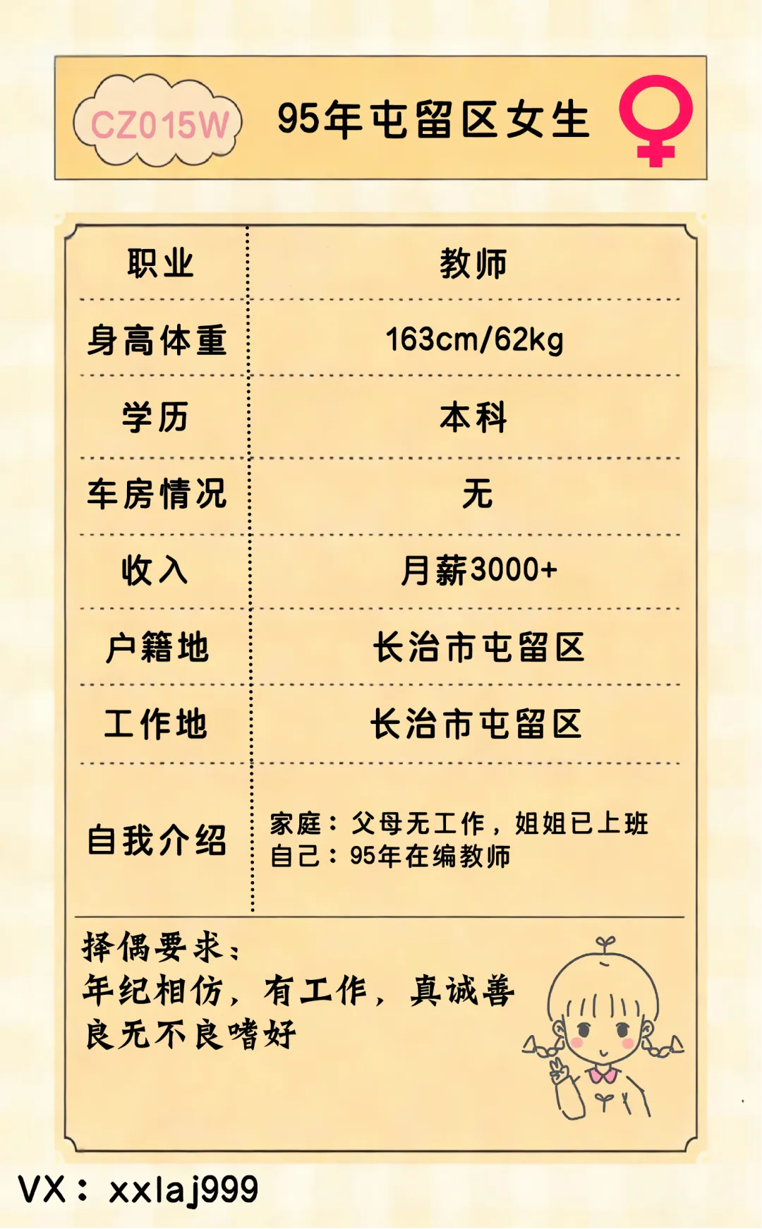 【CZ015W】95年长治市屯留区女生,职业是教师,真诚善良的女生
