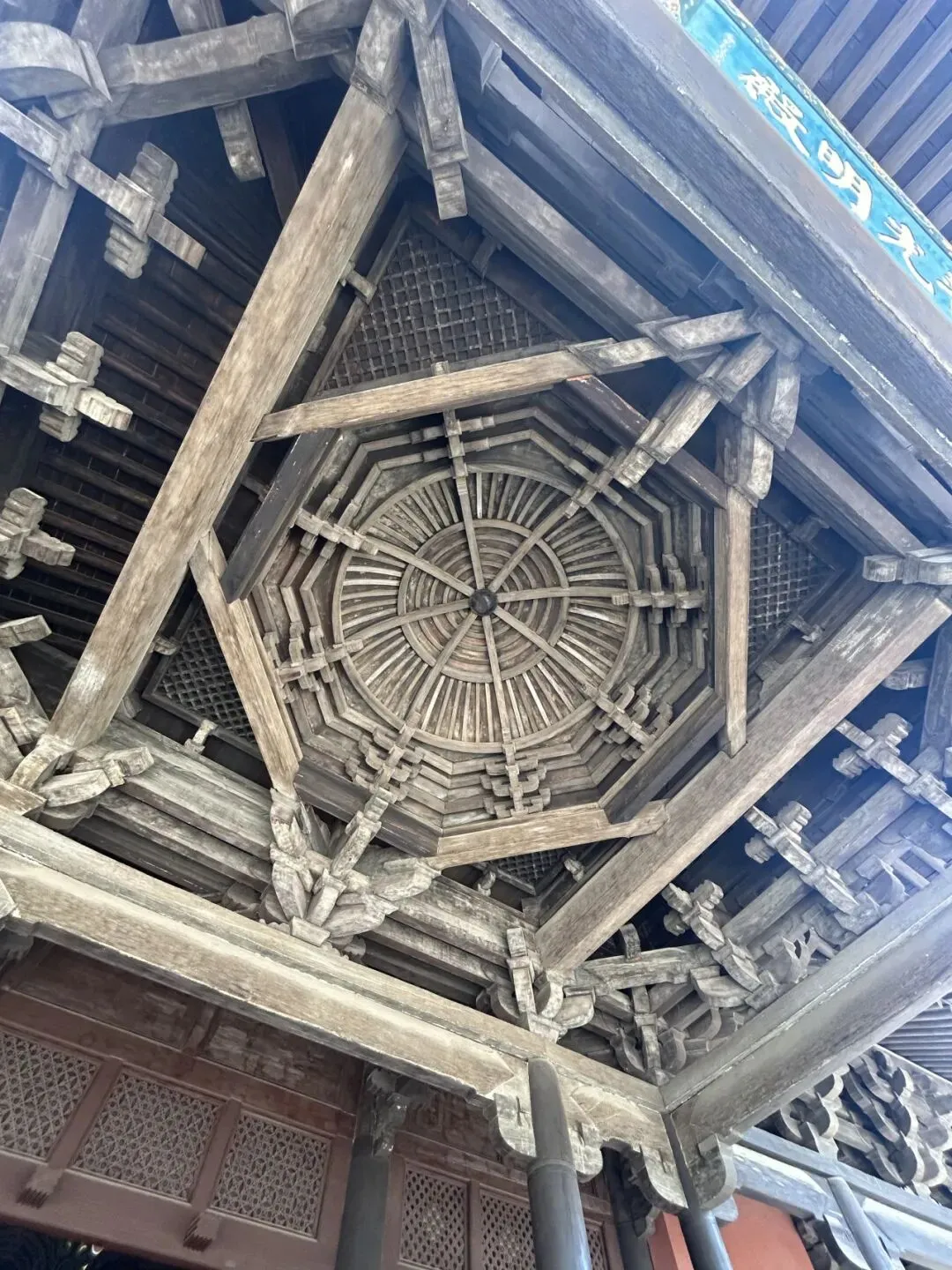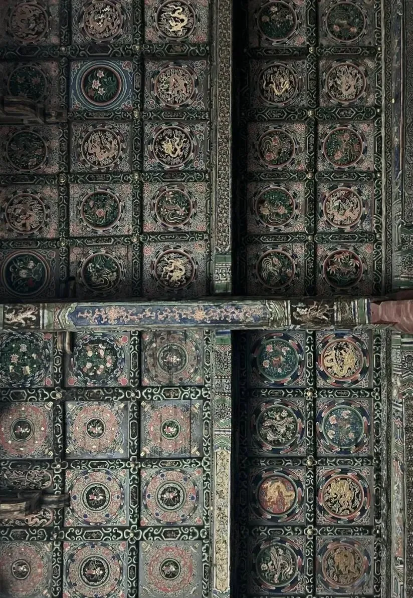 大殿顶部也是方形彩绘的平棊(天花板),大部分也为清代所画,一千块左右,有的导游讲千块的平棋各不相同,也有人说只有两块一样,倒是可以抬头找找(堪称脊椎友好动作)。
