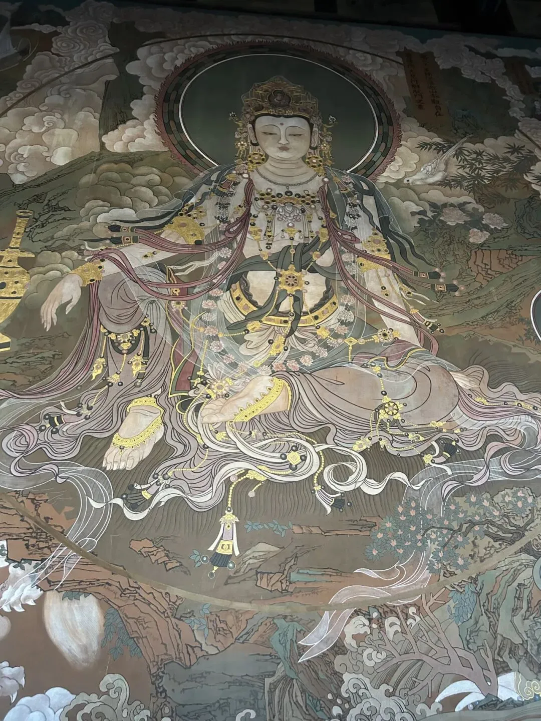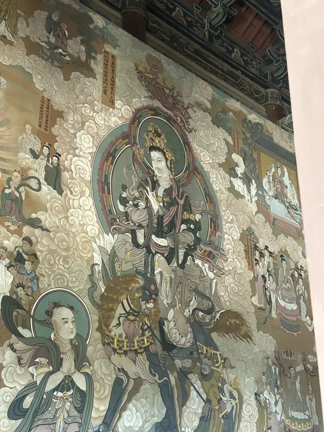 殿内的壁画是普光明殿的一大亮点,壁画《善财童子五十三参》讲述了善财童子在文殊菩萨的指引下游历百城,参访五十三位大师,最终成为菩萨的故事。这些壁画由中央美术学院的两位教授带领150位学生历时三年完成,使用矿物质颜料和中国画颜料,汲取了历代壁画的精华,展现了传统绘画艺术的魅力。