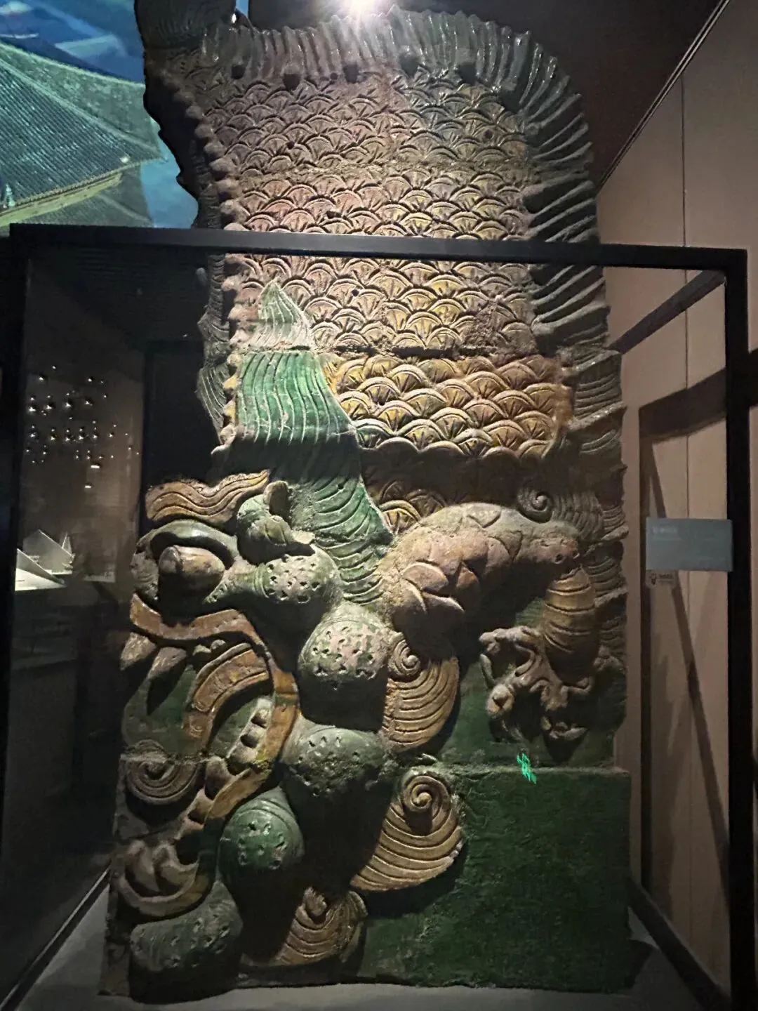 大殿采用最高等级的庑殿顶,坡度平缓,出檐深远,四翼如飞,尽显皇家寺院的恢弘气势。屋顶正脊上的琉璃鸱吻高达4.5米,北吻是金代原物件,南吻是明代的物件,历经近千年风雨,色泽依然艳丽,是现存古建中最大的琉璃鸱吻。鸱吻是龙的九子之一,喜欢水,把它放在木质结构建筑上面,古人的寓意是镇火的作用。(可以到大同博物馆里更直观的感受这座鸱吻的尺寸与细节)