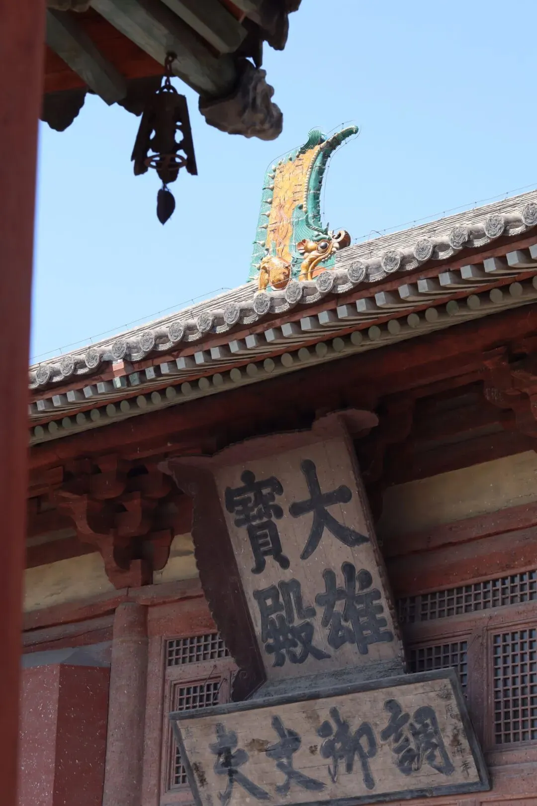 而转身继续走,能看到一个体量很小的山门,为砖雕结构,体现了清代建筑的精细工艺。而后豁然,只在台阶下便能仰视主殿的巨大牌匾,是一种很亲切的很厚重的感受,一仰头很难不“哇”一下,这座大雄宝殿始建于辽清宁八年(公元1062年),金天眷三年(公元1140年)依旧址重修,今天的大雄宝殿是辽代的地基、金代的殿宇、明代的佛像、清代的壁画,是四个朝代合建的艺术宝库。