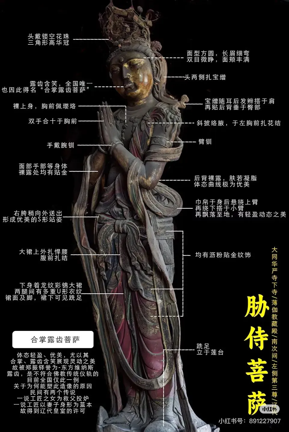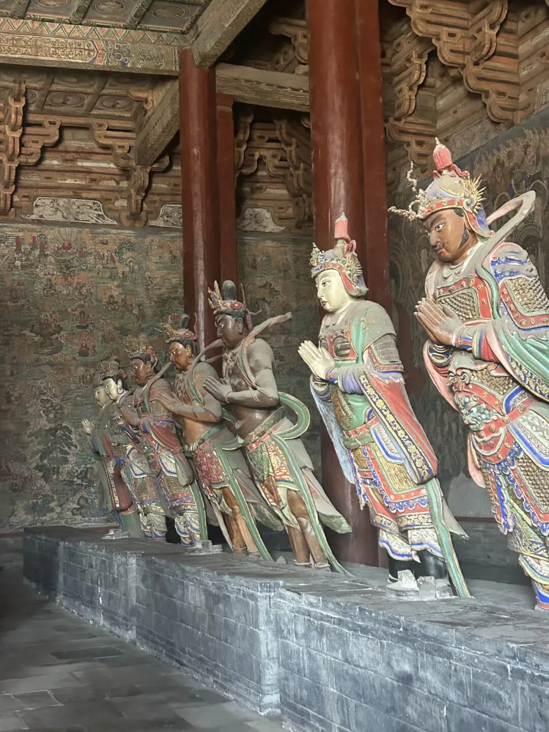 大殿正中端坐在莲花座上的是“三世佛”,也就是过去的“燃灯佛”,现在的“释迦佛”,还有未来的“弥勒佛”。以主佛为中心,配置四大菩萨、胁侍、供养童子,四大天王等像,构成一堂诸佛讲经的生动场面。其中最负盛名的是合掌露齿菩萨胁侍像。这尊菩萨像体态婀娜自然,上身微裸,饰物精致,面相丰满圆润,尤其那露齿微笑的神情,既含蓄又充满亲和力,一扫宗教偶像的威严刻板,洋溢着人间生命的活力与智慧之美,被后世誉为“东方维纳斯”,是中国雕塑史上不可多得的写实主义杰作。我倒是觉得,比起西方单一颜色的雕塑,我们古代雕塑的颜色加成、面部神态塑造更胜一筹呢~