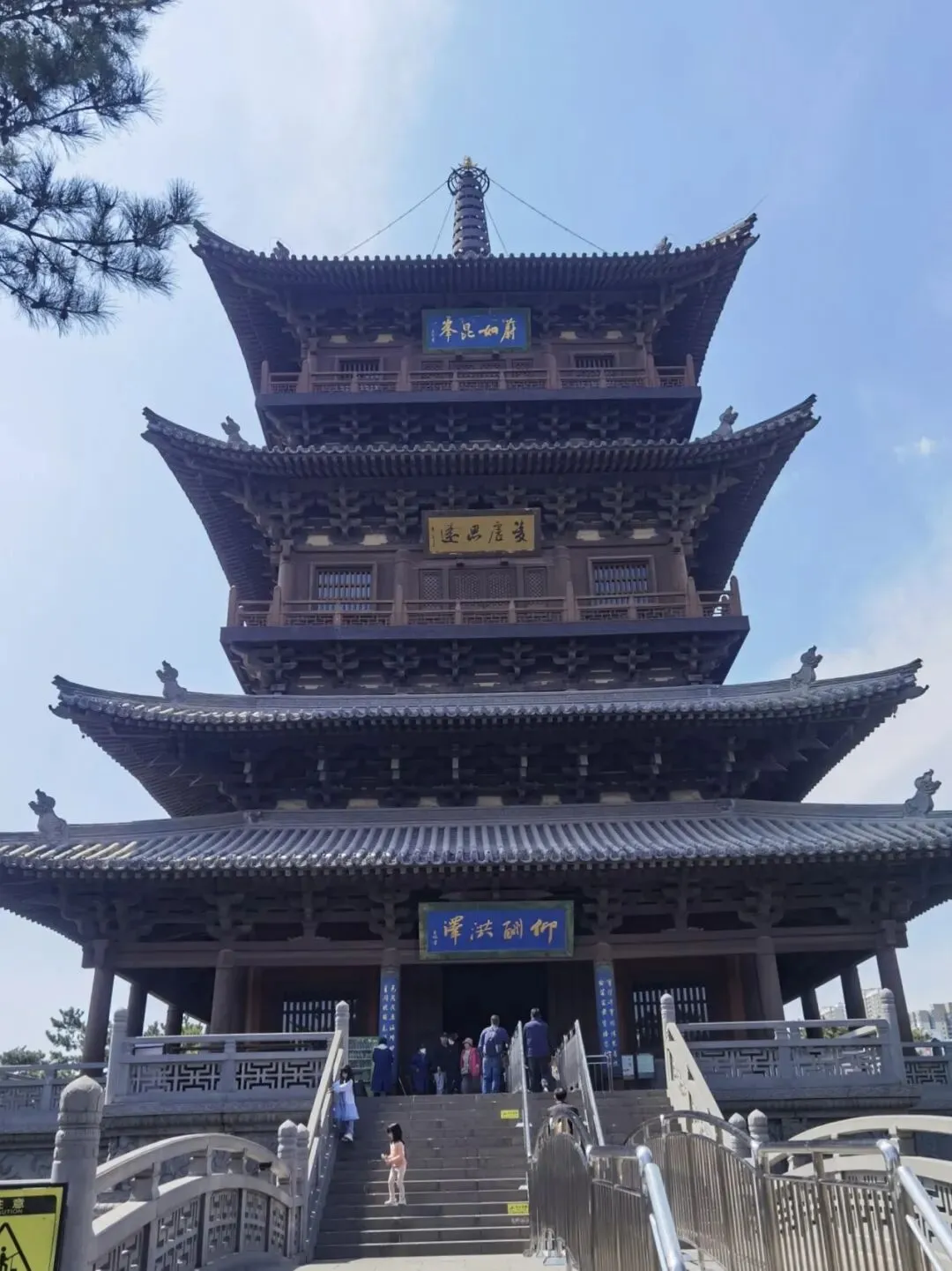 包括塔刹在内通高43.5米,为三层四檐攒尖顶,塔身呈明三暗二五层结构。其设计融合辽金建筑风格,虽为后期修建但保留唐代遗风,塔顶饰金盘,底部环绕莲池,整体庄严恢弘,算是当代仿古建筑中的佳作。四面每层都有匾额,而且几乎都是名家书法。从大雄宝殿出来隔空观赏此塔全景和部分的牌匾也为一趣事了。(信心开敷匾用的是颜真卿书法,仰酬洪泽匾用的是苏轼书法。这两块匾额的内容,出自云冈第十一窟《太和七年邑义信士女等五十四人造像记》中,“弟子等得蒙法润,信心开敷,意欲仰酬洪泽,莫能从随”之句。慈被十方用的是黄庭坚书法,它的内容出处同上,“慈被十方,泽流无外”一句。蔚如昆峰用的也是黄庭坚书法,内容出自西安碑林收藏的《北魏晖福寺碑》中的“功殚世奇,蔚如昆峰”。玄期有寄用的是苏轼书法,它同样出自《北魏晖福寺碑》,“庶凭冥津,玄期有寄”这一句。形应万物仍为苏轼书法,指的是佛和菩萨会化身万物,来度化有缘之人。凌虚思远用的是米芾书法,意思为在空中飞得越高,就看得越远。京华大观也是米芾书法,意指大同为北魏京城,辽金西京是个足够繁华的地方。灵虑巍凝仍为米芾书法,出自云冈石窟的《比丘尼昙媚碑》中,“灵虑巍凝,悟岩鉴觉”一句。契合乾坤用的是王羲之书法,指的是修行这种事,完全符合世间万物的运转规律。深入佛智署名是月臂,是弘一法师李叔同用过的ID之一。内容出自《华严经》中“深入佛智,永出三界”一句。昭廓心境还是弘一法师用月臂ID留下的书法,同样出自《华严经》“剖裂玄微,昭廓心境”这一句)