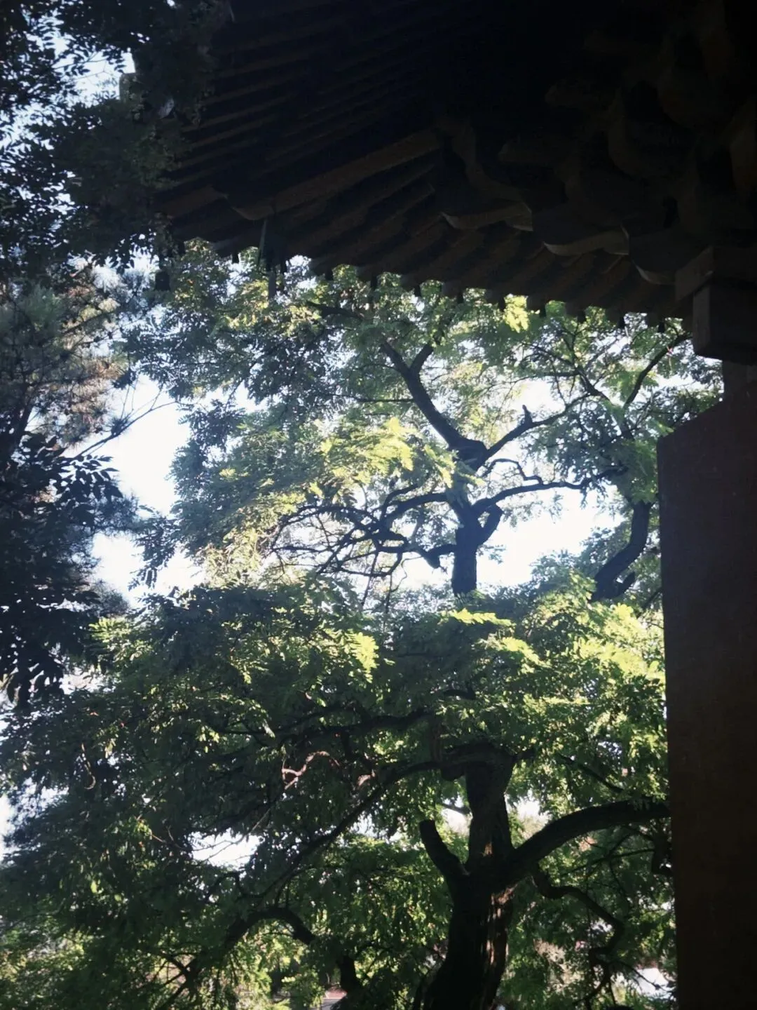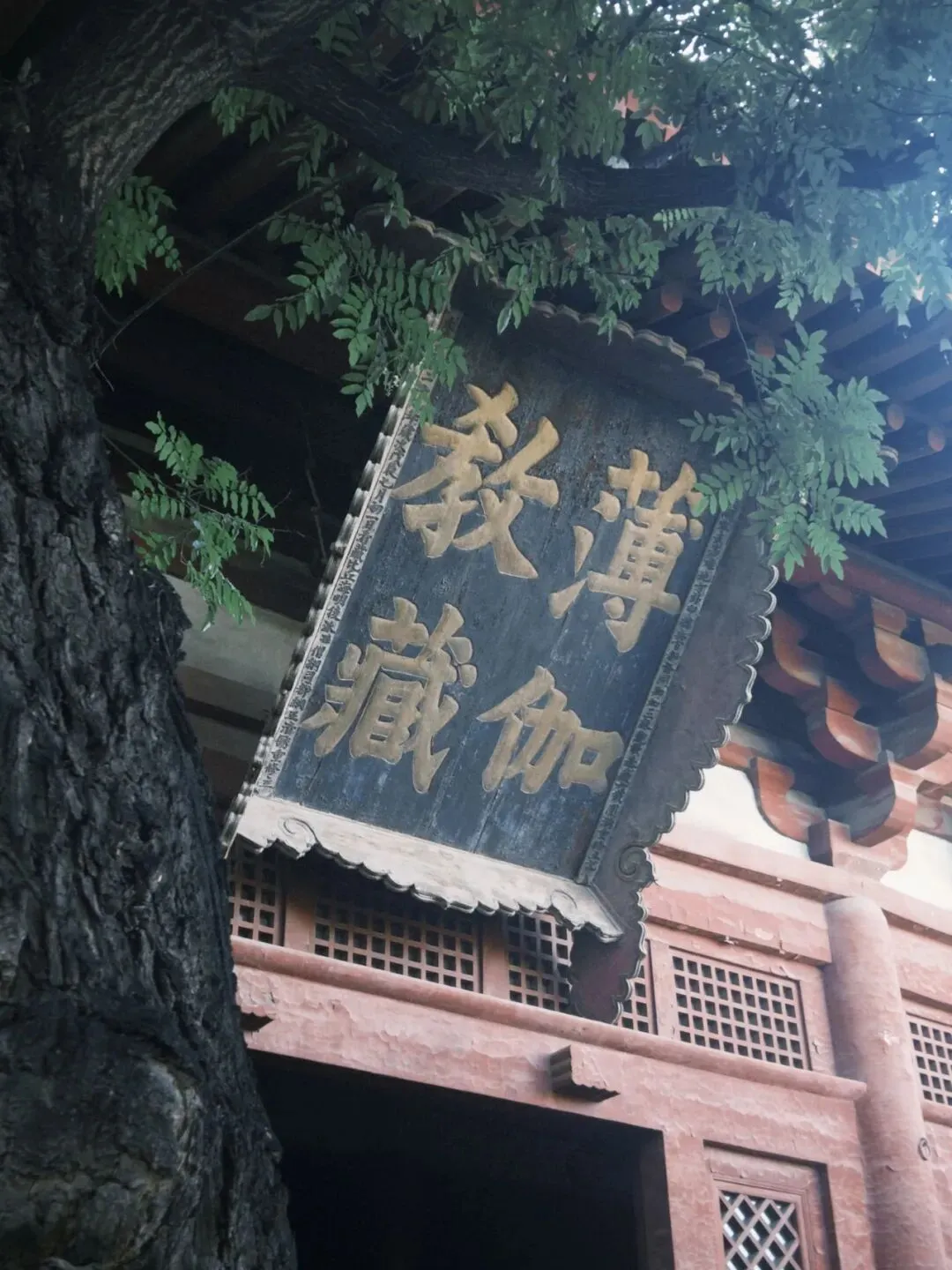 再往西走就是华严寺内唯一幸存的辽代建筑薄伽qié教藏zàng 殿了,建于辽重熙七年(1038年)。虽规模小于大雄宝殿,但其历史价值与艺术价值无与伦比。薄伽教藏殿是华严寺下寺的主殿,作为藏经殿。大殿台基高阔,月台敞朗,月台上的一棵枝叶繁茂的大树也为千年佛殿多了几分生机。