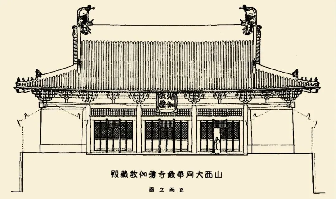 殿身面阔五间,单檐歇山顶。殿顶举折平缓,出檐深远,檐柱生起显著。“薄伽”是世尊对佛陀释迦牟尼的尊称,表示佛陀是世间最尊贵、最值得尊敬的人,而“教藏”是指这里乃是藏经之处。楼阁式藏经柜及天宫楼阁,被梁思成赞不绝口:“千年国宝,无上国宝,罕有的国宝”,称其为“海内孤品”。
