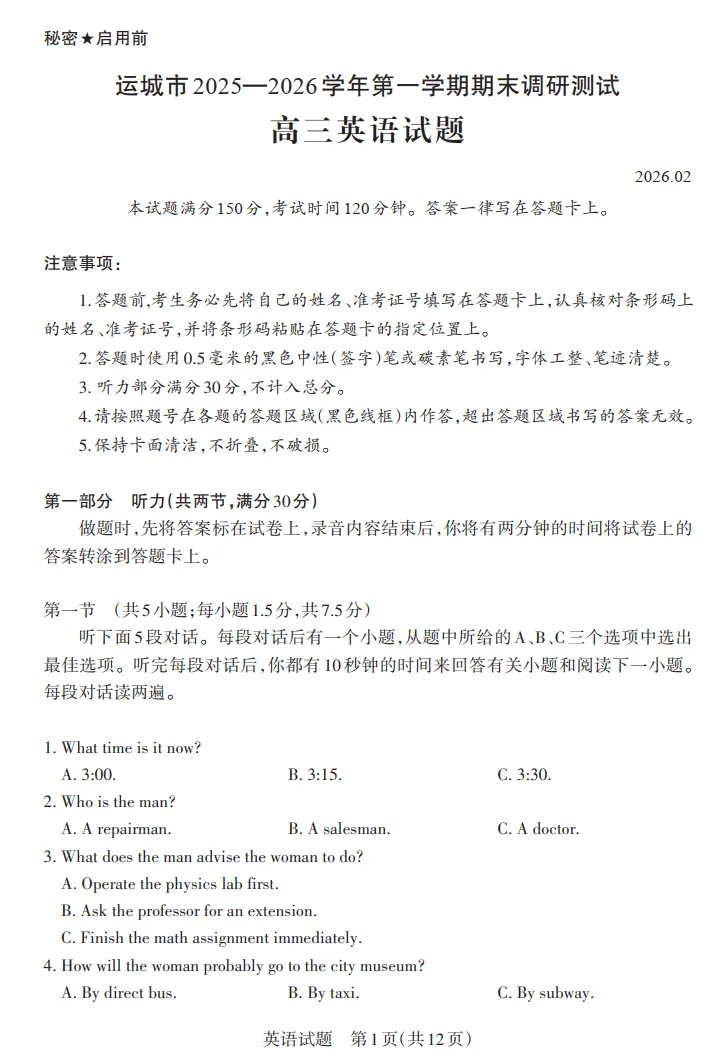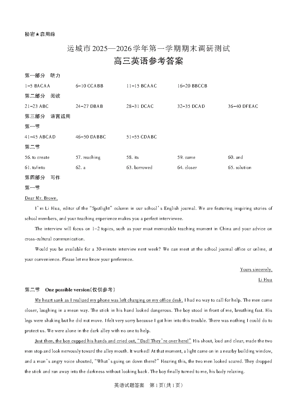 最全答案!山西思而行联考暨阳泉/大同/运城市2025-2026学年第一学期高三期末调研测试全科答案解析汇总