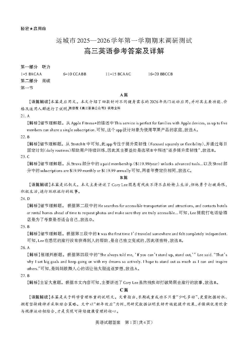 >运城、大同、阳泉市2025-2026学年高三期末调研测试答案