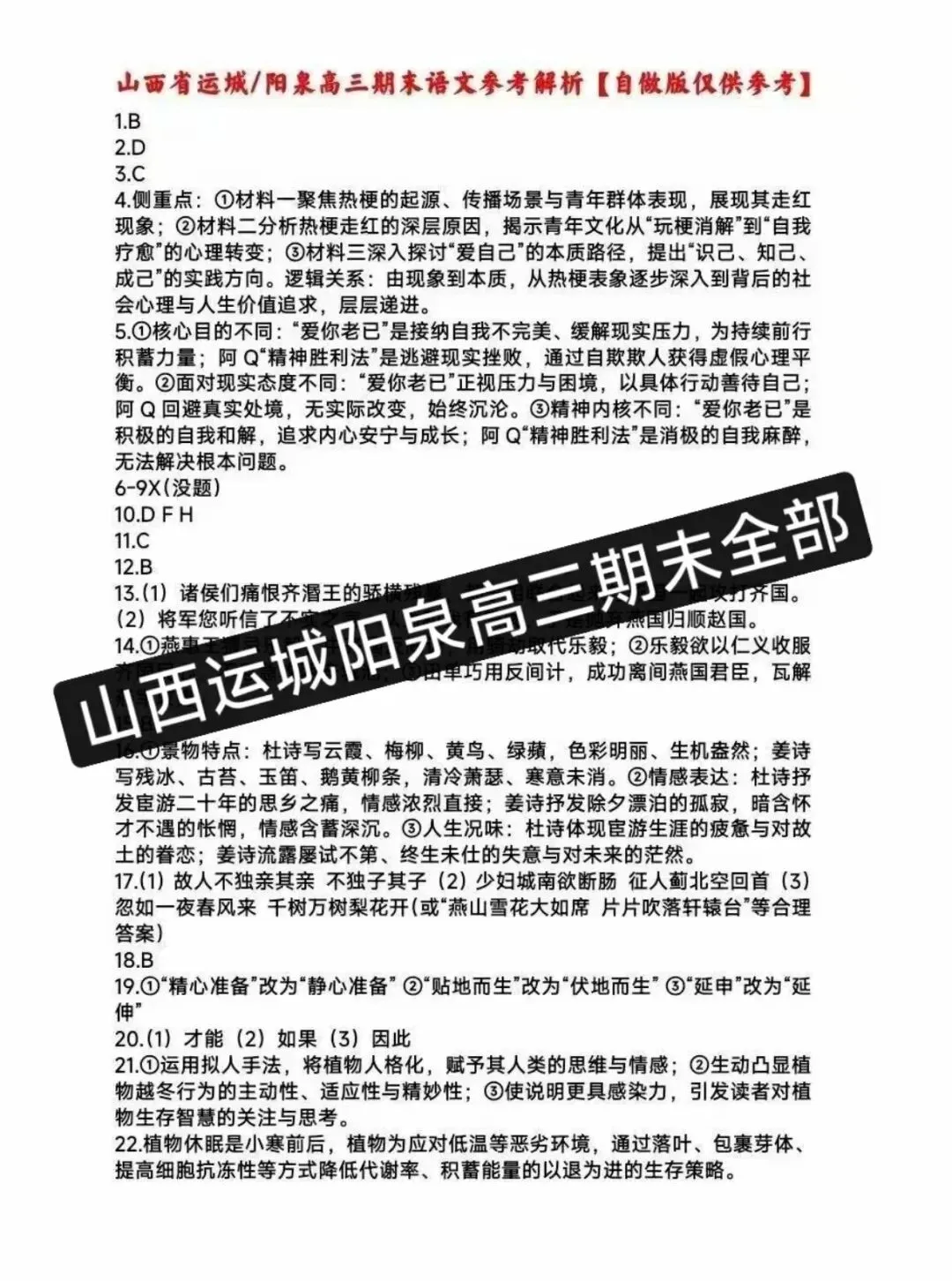 参与地区及参考人群:运城市部分高中学校及高三在校学生,难度系数0.65左右