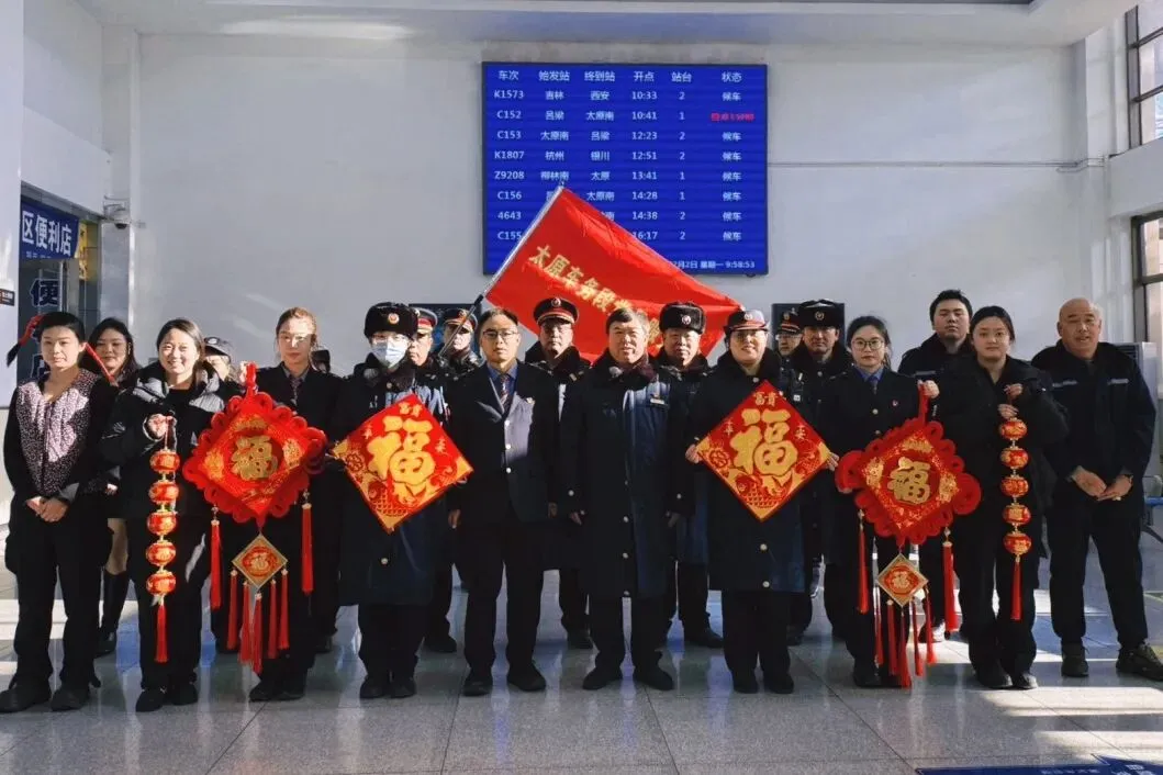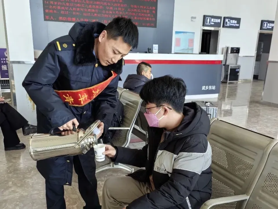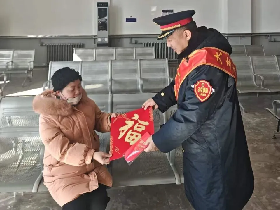 武乡东站春运启动仪式围绕“平安春运、有序春运、温馨春运,让旅客体验更美好”的目标,向过路旅客提供热水等热心服务并赠送旅客“福”字等新年祝福。