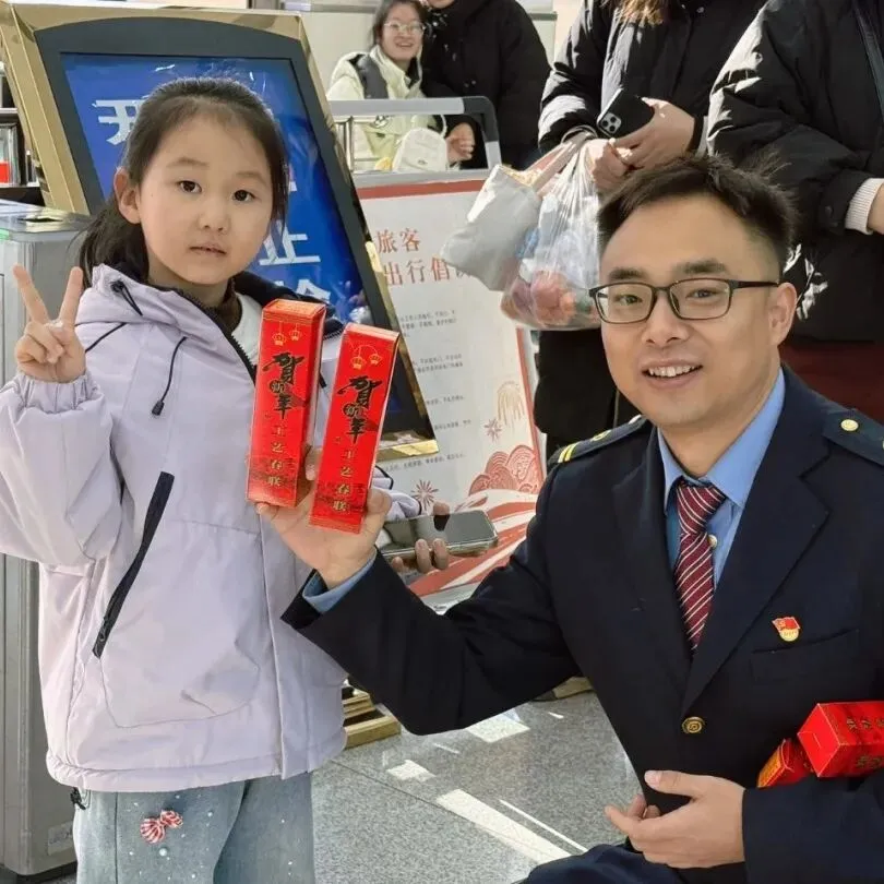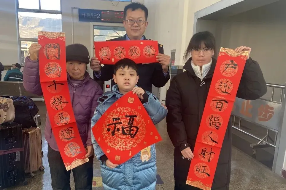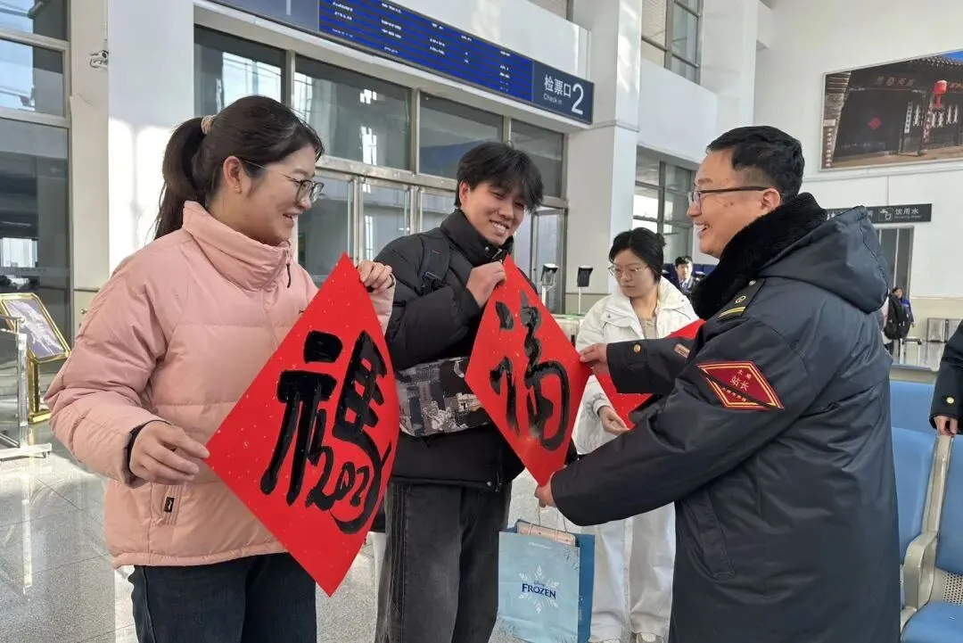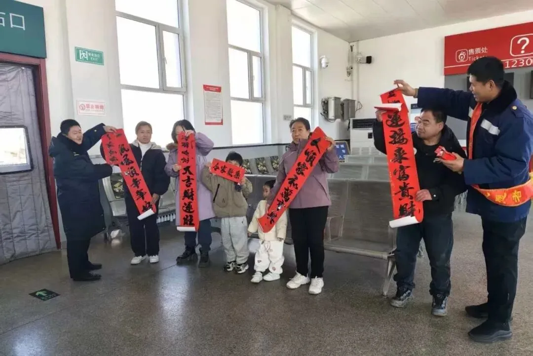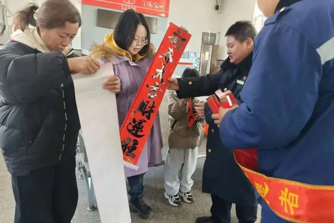 为营造温馨和谐的出行氛围,沁县站车站工作人员在候车大厅现场为春运途中的旅客赠送吉祥春联。红纸墨香间洋溢着浓浓年味,欢声笑语中传递着深切祝福。