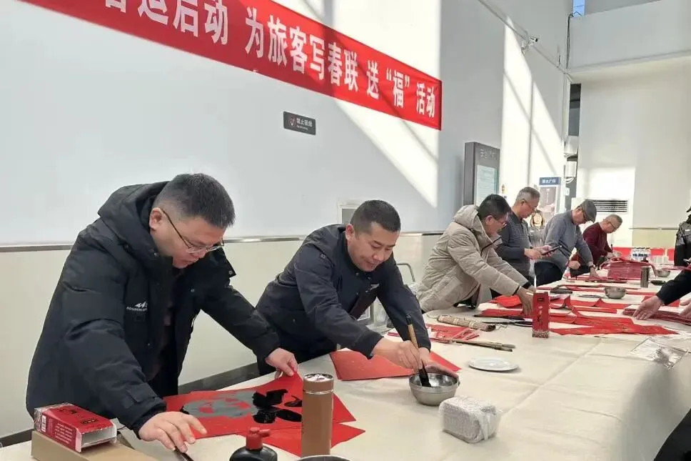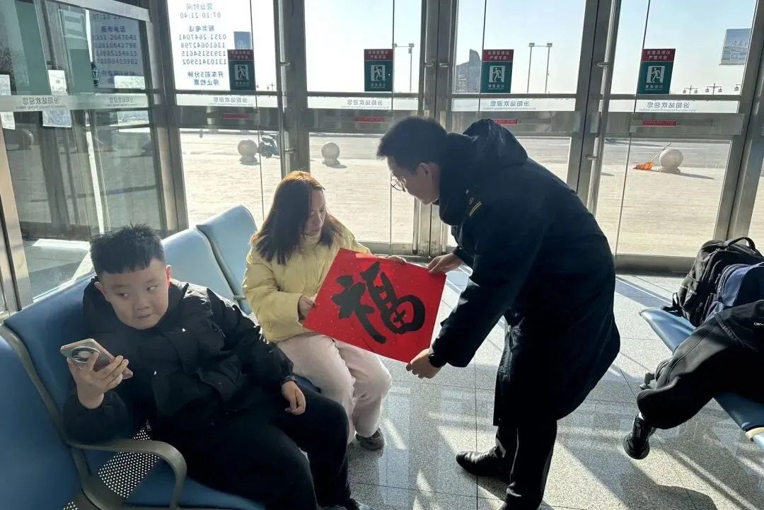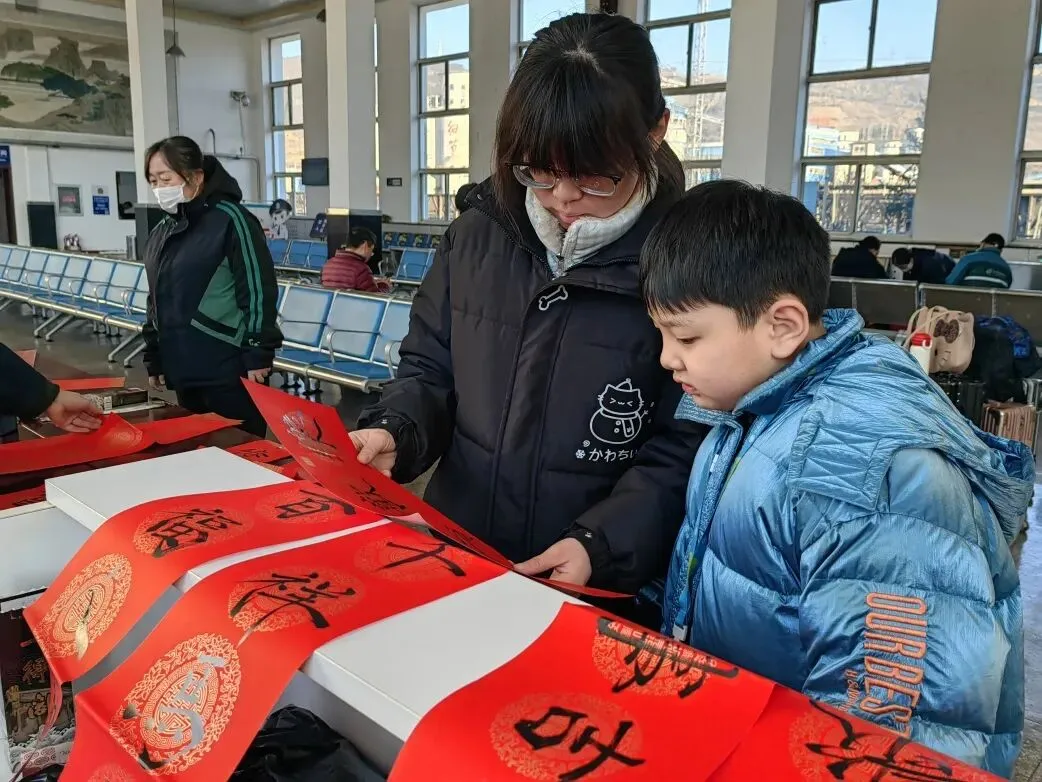 古交站候车室内暖意融融,墨香四溢。一场以“送福字、送春联”为主题的新春活动正在这里温馨举行,为南来北往的旅客送上旅途中的第一份“年味”。