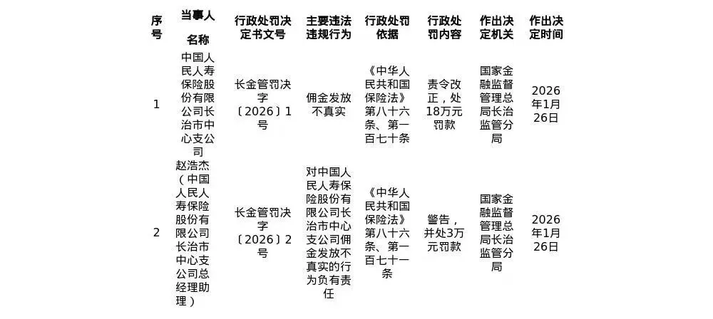 2026年1月30日,国家金融监督管理总局长治监管分局连续发布两份行政处罚决定,直指中国人民人寿保险股份有限公司长治市中心支公司(下称“人保寿险长治中支”)在佣金管理方面存在的违规问题。