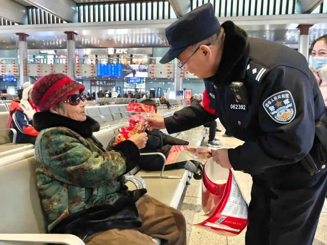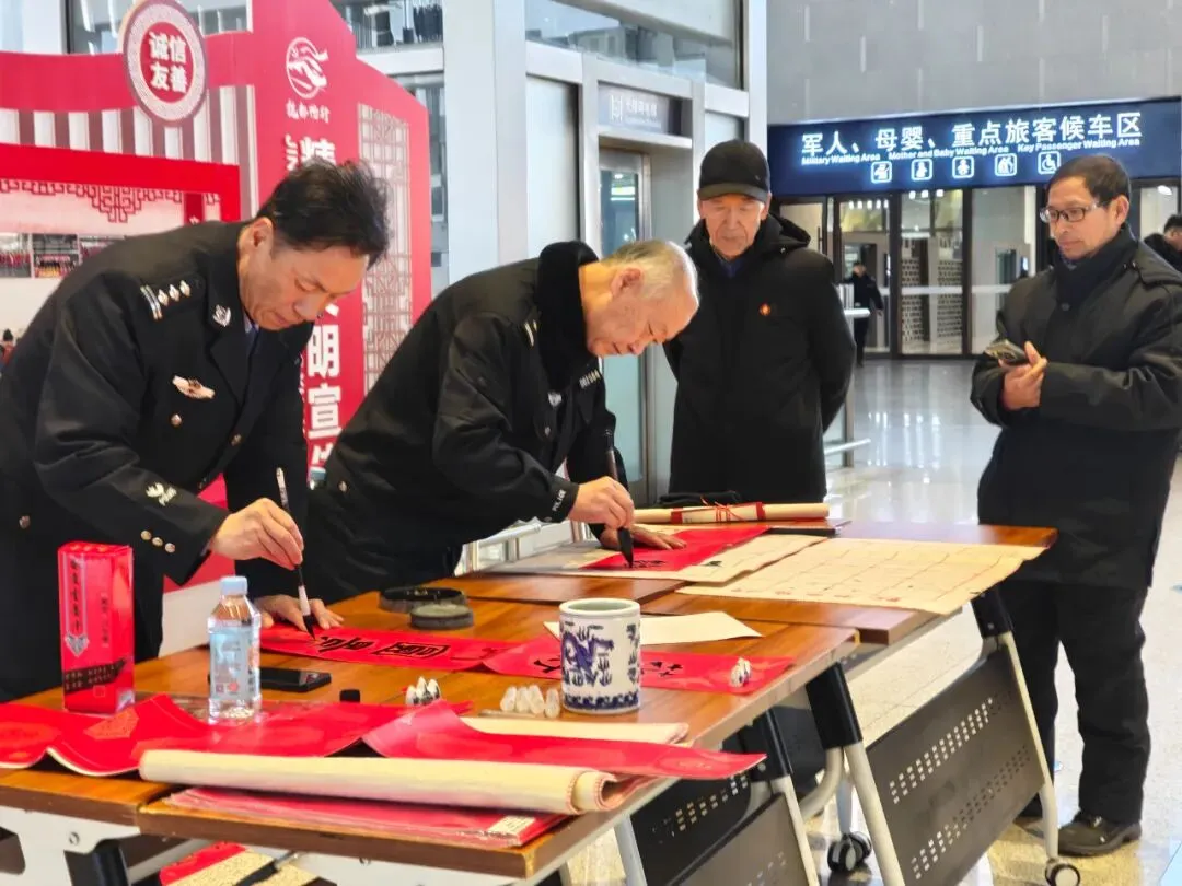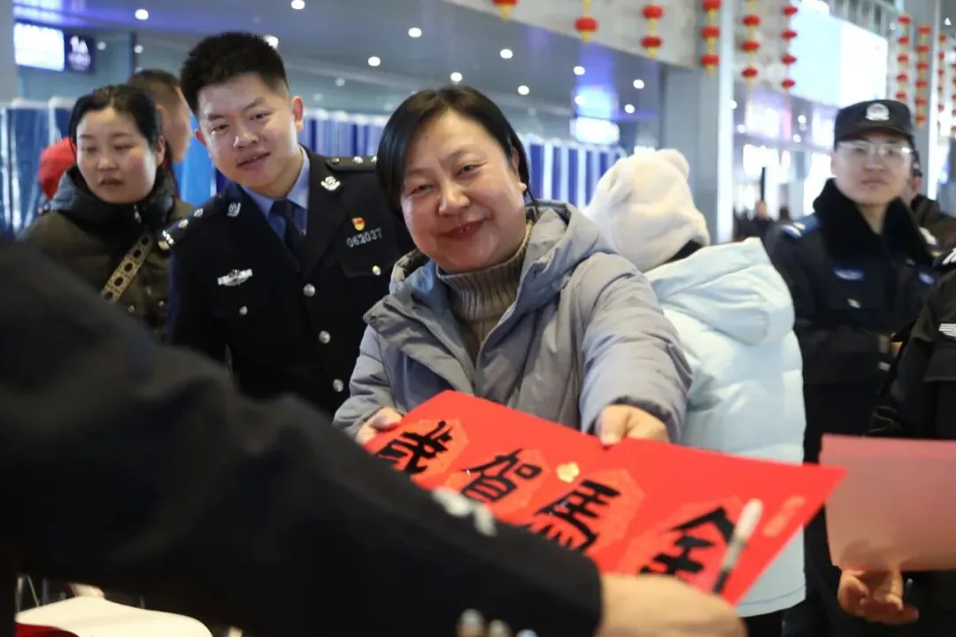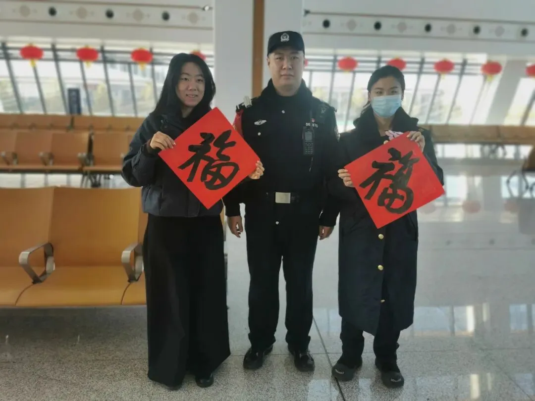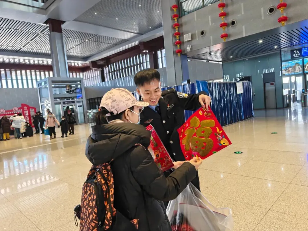 民警整理好春联、递送给候车旅客