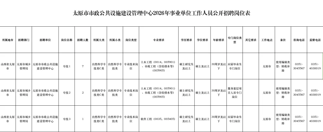 附件:太原市市政公共设施建设管理中心招聘岗位表