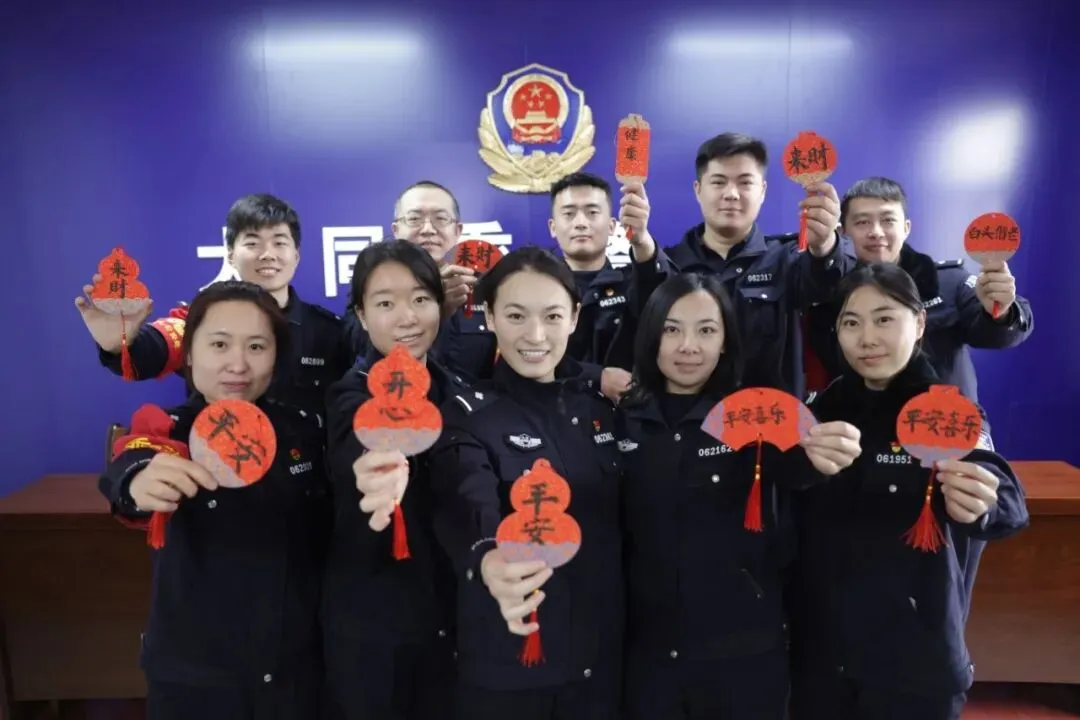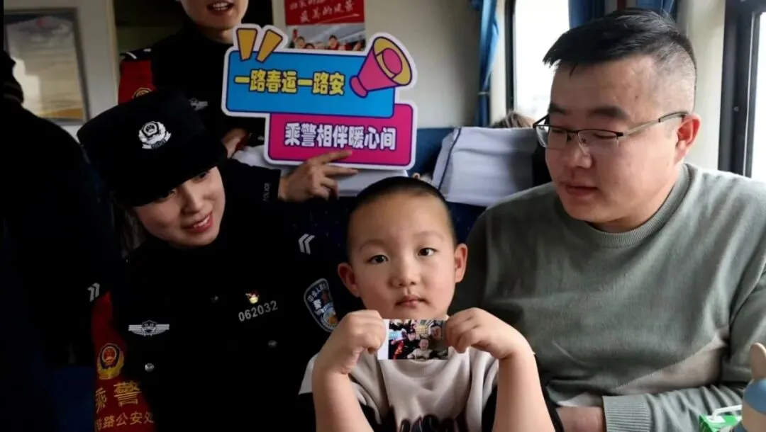 乘警的一声吆喝,让不少旅客眼前一亮。车厢被布置成临时打卡点,没有复杂的布景,却有最暖心的画面: 这边,一家三口在乘警身边,比出“耶”的手势,镜头定格下孩子脸上的笑容,乘警的警帽和制服,成了照片里最安心的“背景”;照片背面,还有大同乘警支队手写的祝福语:“韶华长在,明年依旧,相与笑春风!”