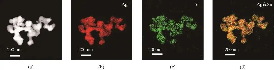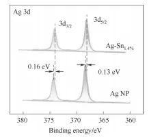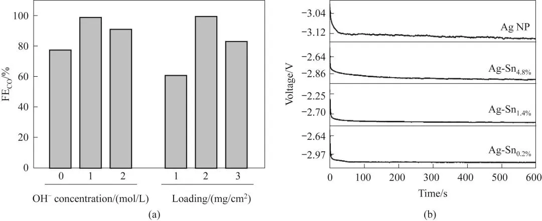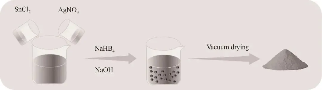 )在阳极电位的驱动下可以跨阴离子交换膜(AEM)迁移,并进一步与阳极产生的H+结合生成CO2。技术经济分析表明,阳极再生的CO2占能量输入的50%以上,这大大降低了能量效率(EE)[12-13]。因此,近中性和碱性电解质中的CO2RR通常稳定性和碳效率较低,这严重限制了其工业应用。近年来,酸性电解液体系中丰富的H+可以促进阴极CO2的再生[14],有效提高碳效率,同时电解槽中使用的质子交换膜(CEM)可以防止含碳的阴离子向阳极迁移,近年来成为一大研究热点。与此同时,CO2RR的实际应用受到反应物传质效率的严重制约。在传统H型电解槽中,通过溶解在水中的CO2参与反应,CO2在水中较低的溶解度[1 atm(1 atm=101.325 kPa)、25℃时仅为33 mmol/L]成了制约反应活性的主要因素,催化剂表面CO2传质速率不足,导致难以维持高电流密度下的持续反应[15]。流动电解槽相比H型电解槽有所改善,但仍受限于阴极电解液的离子传递速率,虽然能达到较高的电流密度,但能耗相对较大,并不能完全适用于工业体系。膜电极(MEA)组件(图1)中催化剂与离子交换膜直接接触,能以最低的能量损耗实现工业级电流密度,相较于H型电解槽和流动电解槽具有显著优势[16-17]。此外,MEA产物分离简单,易于模块化和规模化,适合工业化应用,尤其在可再生能源存储和绿色化学品合成领域前景广阔[18]。然而,酸性条件下高质子浓度引发剧烈的竞争性析氢反应(HER),以及高电流下的催化剂稳定性问题,使其在MEA体系中的大规模应用仍极具挑战[19-20]。图1MEA电解槽示意图Fig.1Schematic of MEA cell目前,一些金属催化剂,如碳包覆结构[21]以及分散的金属单原子[22]已被广泛应用于CO的生产。尽管CO法拉第效率能达到90%以上,但电流密度往往低于工业要求(200 mA/cm2)。银(Ag)基催化剂因其本身具有良好的CO选择性,常被用于碱性或中性CO2RR[23-24],这得益于其*CO中间体吸附较弱,容易解吸生成CO,但其在酸性介质中的活性位点易被H+覆盖,导致高电流密度下选择性急剧下降[25]。研究表明,通过引入亲氧金属调节Ag的电子结构,可优化*COOH中间体的吸附能并抑制HER副反应[26-27]。然而,酸性体系下第二金属掺杂引发电子结构的改变以及对中间体吸附的构效关系和作用机制仍需进一步验证。本文利用化学还原法精准合成了一系列不同比例的Ag-Sn双金属催化剂,并在酸性(pH=2)MEA体系中展现了优异的CO2RR性能。深入探究了Sn的掺入对Ag电子结构的影响,揭示了Ag表面电子结构变化对反应过程中关键中间体的影响规律。此外,还考察了催化剂制备过程中pH、催化剂负载量等关键因素对产物选择性的调控作用,以及Sn掺入量对活性位点暴露程度的影响,为后续的研究提供有利参考。氢氧化钠(NaOH,纯度96%),国药集团化学试剂有限公司;硝酸银[AgNO3,纯度99.8%],北京伊诺凯科技有限公司;硼氢化钠(NaBH4,纯度98.0%),上海阿拉丁生化科技股份有限公司;二水氯化亚锡(SnCl2·2H2O,纯度98%),国药集团化学试剂有限公司;实验用水是电阻率为18.25 MΩ·cm的去离子水。首先,将5 ml SnCl2·2H2O(0.05 mol/L)和5 ml Ag(NO)3(1 mol/L)依次加入80 ml去离子水中。随后,向混合溶液中加入7 ml NaOH(1 mol/L),充分搅拌使混合物均匀。最后,缓慢加入10 ml NaBH4(0.5 mol/L),以完成还原反应。反应结束后,通过离心分离产物,并在室温下进行真空干燥。为获得不同锡含量的样品,调整了SnCl2·2H2O的浓度:分别添加0.1 mol/L SnCl2·2H2O溶液和0.03 mol/L SnCl2·2H2O溶液,其余制备条件保持不变。最终产物中的Sn含量通过电感耦合等离子体(ICP)测定。采用相同方法制备了纯银纳米粒子(不添加SnCl2·2H2O)。为防止Ag+水解和NaBH4分解,所有溶液均需现配现用。催化剂油墨配制:精确称取40.5 mg催化剂粉末,与4 ml异丙醇及120 μl Nafion溶液[5%(质量分数)]混合,采用超声处理30 min,获得均匀分散的油墨。选取4.5 cm×4.5 cm疏水碳纸(YLS-30T)作为气体扩散层,使用喷枪将油墨均匀喷涂,最终控制催化剂总载量约为2 mg/cm2,随后将碳纸置于室温下干燥2 h,裁剪成1 cm×1 cm置于电解槽中进行测试。使用安捷伦气相色谱仪(HS-GC system)测试催化剂对各种气相产物的选择性;使用X射线衍射仪(XRD,Bruker D8 advance)分析催化剂的相组成;通过场发射扫描电子显微镜(SEM,JEOL JEM 2100F)对催化剂的表面形貌进行表征;利用扫描电子显微镜(SEM,HITACHI SU8000)和透射电子显微镜(TEM,JEOL JEM-2100F)对催化剂的形貌及表面元素分布进行表征;通过X射线光电子能谱仪(XPS,Thermo Scientific K-alpha)测定催化剂的金属价态(XPS数据在使用前均与C的标准峰284.8 eV进行了校正);采用电感耦合等离子体发射光谱(ICP-OES,Optima 8300)对催化剂中Ag和Sn的比例进行定量分析。使用膜电极组件(MEA)测试催化剂在酸性CO2RR过程中的性能。MEA电解槽是两电极体系,可以有效避免CO2溶解度低的问题,从而提高电流密度。阴极室和阳极室通过质子交换膜(Nafion 117)隔开,阳极催化剂为负载在钛网上的IrO2。测试通过电化学工作站(PARSTAT PMC-1000)施加反应所需的电流,CO2气体通过润湿进入阴极,使用气体流量计将CO2的流量控制在50 cm3/min(标准工况)。阳极产生的气体通过气液混合泵从阳极中排出。阴极出口连接有热导检测器(TCD)的气相色谱仪(Agilent 8890),用于分析产物成分。根据施加电流及气相色谱测定的气体浓度计算法拉第效率。通过化学还原法制备了不同比例的银/锡纳米颗粒及银纳米颗粒(Ag NP),利用过量的硼氢化钠使反应还原充分,制备过程见图2。通过控制Ag、Sn