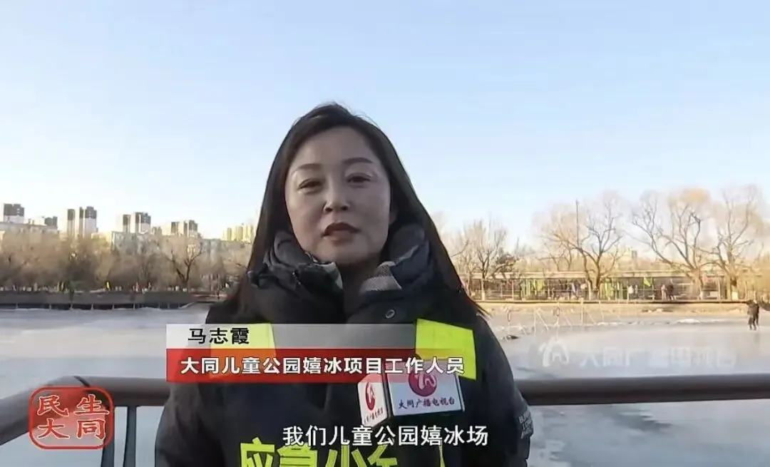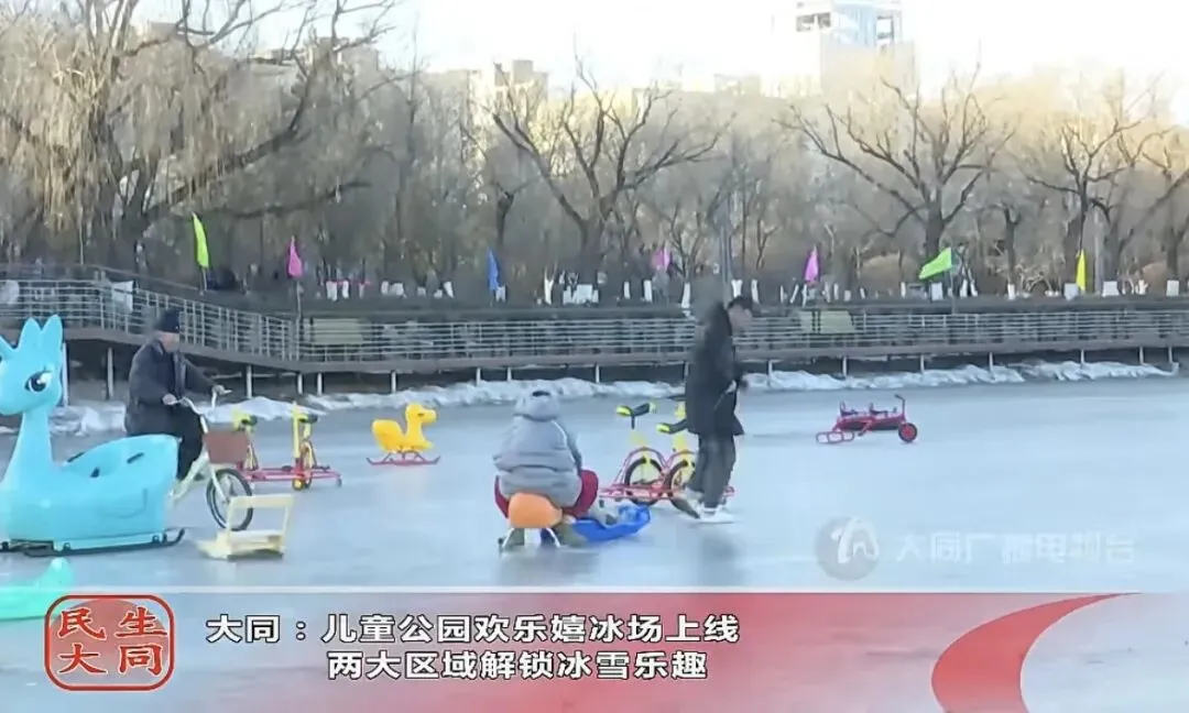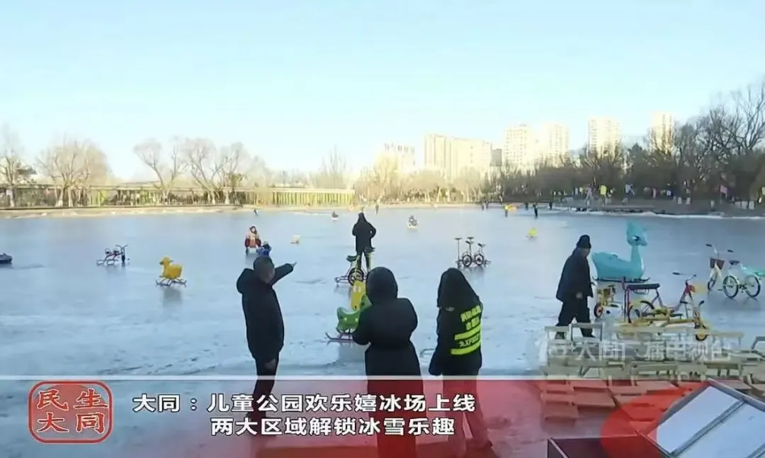 大同儿童公园嬉冰项目工作人员马志霞:我们儿童公园嬉冰场为了给游客一个全新的嬉冰体验,设有划龙舟、情侣自行车、木制冰车、小黄鸭等各种游乐项目。