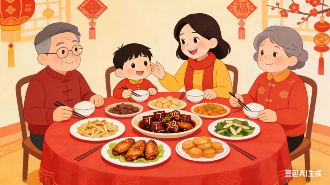 刚坐下,我就一眼看到了最爱吃的可乐鸡翅。等爷爷奶奶都坐定后,妈妈笑着打趣我:“小馋猫,看你都快流口水了,赶紧吃饭,吃饱了才有力气放烟花呀!”