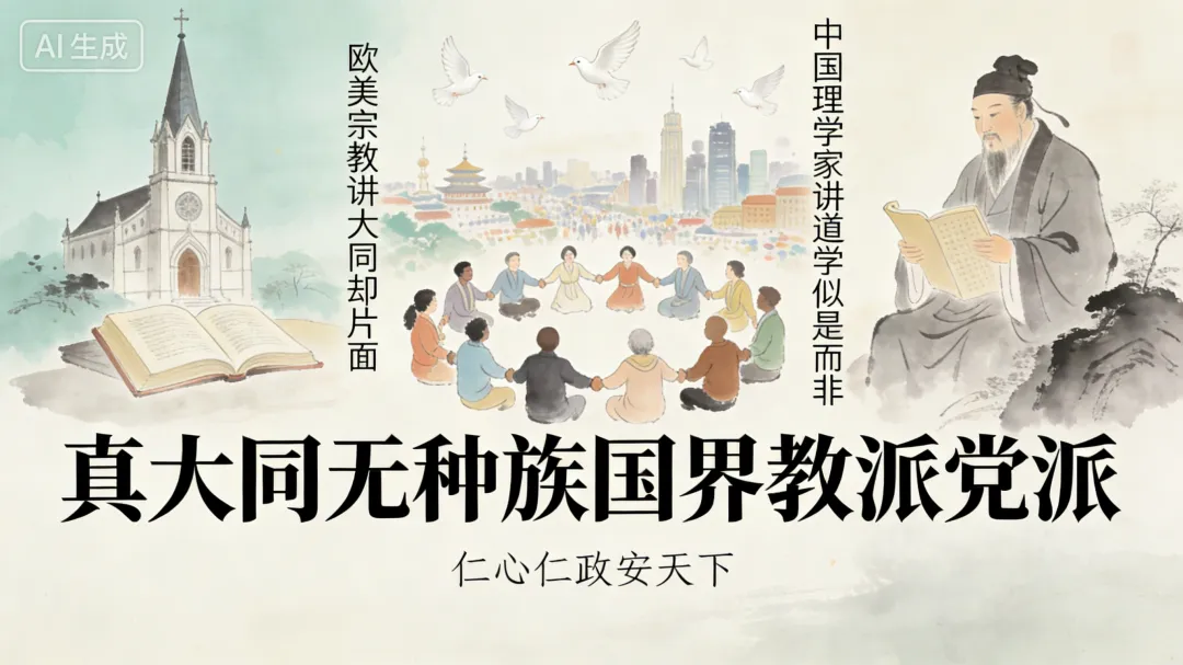 今欧美人之在宗教者,亦讲大同,但只能说得片面。恰如中国之理学家讲道学,同一似是而非。真讲大同,无种族国界教派党派之说,同归一道,无私心,无嫉妒,仁心仁政安天下,真行道德平天下。如欧美不知道德而行忠信,忠信即道德之先行,故可一时文明富强。耶稣本是大同博爱主义,因后世教徒误会,将其教作为党,生出教争之祸,非大同也。