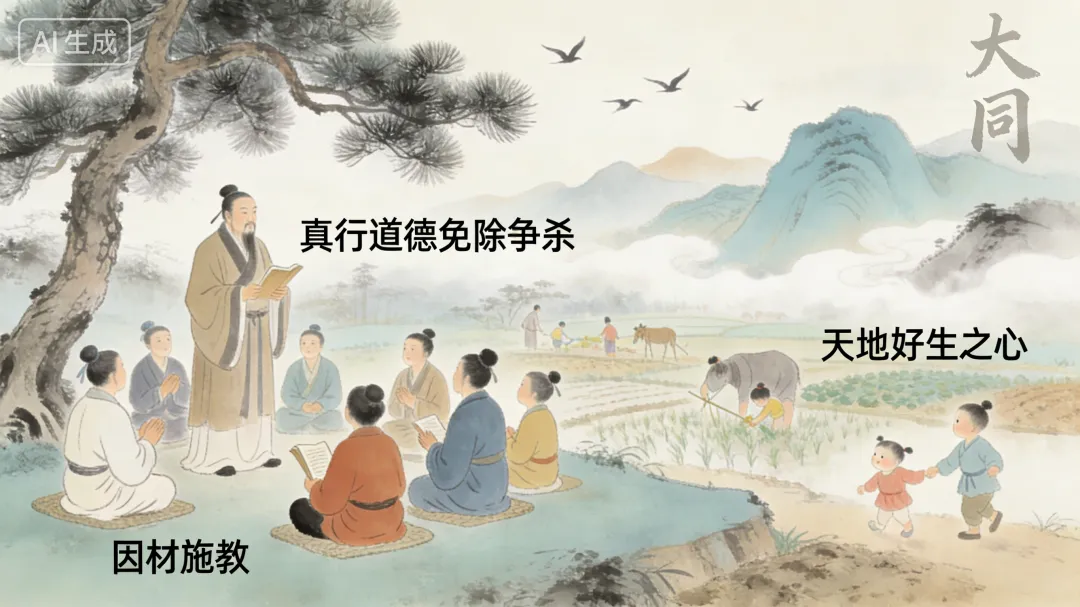 前圣立教,因时、因地、因材施教,不敢言大同者,知真道德之不行,不得已而立教之苦衷也。真行道德,免除争杀之祸,即是天地好生之心。合天地之心,是谓大同。