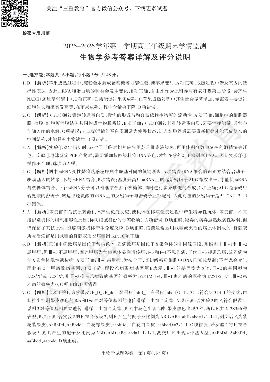 >2025-2026学年 大同/阳泉/运城市高三1月期末调研考试试题答案!