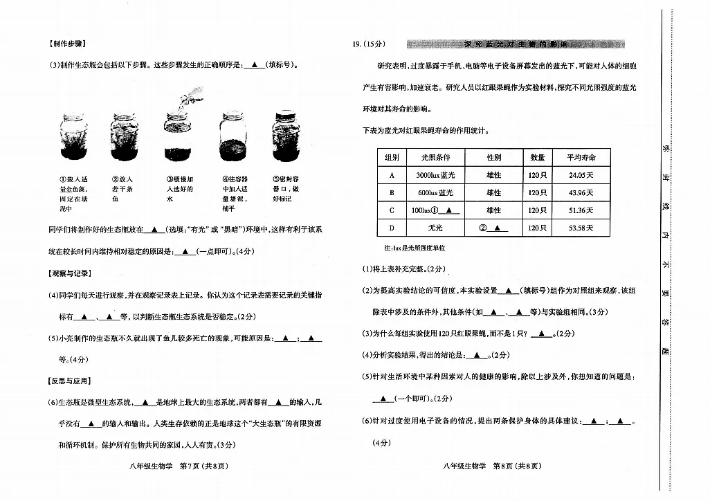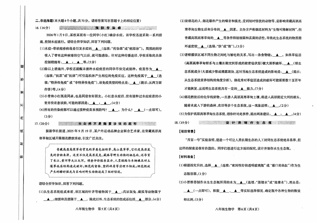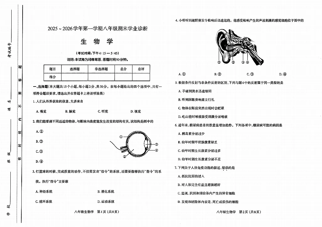 下面要分享的试题是山西太原2025-2026学年第一学期八年级生物学期末试题(前段时间太原考生刚考完)。也许好多家长和老师已经有了这份试题,但是还是有铁粉留言想让分享一下这套八年级的生物期末题。那就给大家整理一下这套试题吧。本试卷共8页,满分100分,考试时间为90分钟。安排在下午的4:15分开考。以下是试卷详情:以上,就是这套考题的详细内容,老师、学生们对此套试题,有什么考后感悟,希望大家能在下面评论区留言,小编会归纳提取大家的思路想法,互相总结提高。获取清晰版试题和试题答案以及更多试题资料请关注下方二维码👇