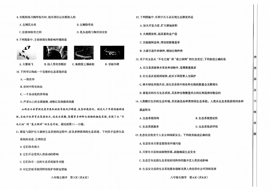 山西太原2025-2026学年第一学期八年级生物学期末试题分享