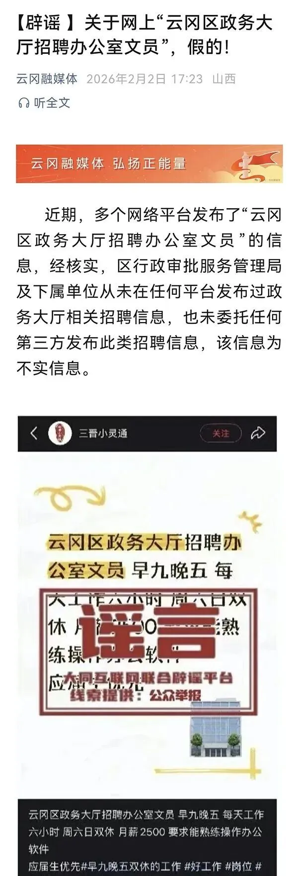 近期,多个网络平台发布了“大同市云冈区政务大厅招聘办公室文员”的信息,经核实,大同市云冈区行政审批服务管理局及下属单位从未在任何平台发布过政务大厅相关招聘信息,也未委托任何第三方发布此类招聘信息,该信息为不实信息。