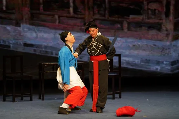 崔云冬(右)和徒弟李博表演《翠屏山·闹酒馆》 / 图片来源:受访者提供