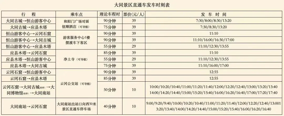大同各景点之间都有景区直通车,方便旅游出行,可以在网上预约时间车次。大同古城景区直通车乘车地点:古城墙东门(和阳门)外和阳广场。三、住宿